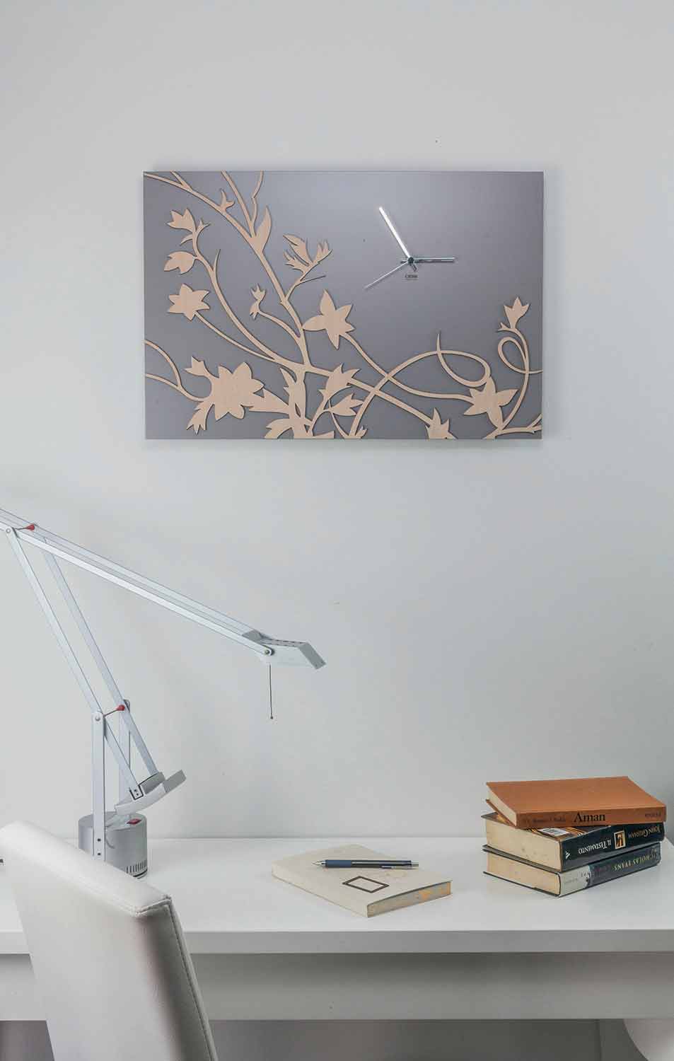 Relógio de parede grande com design retangular e moderno em madeira cinza e decorado, fabricado na Itália.