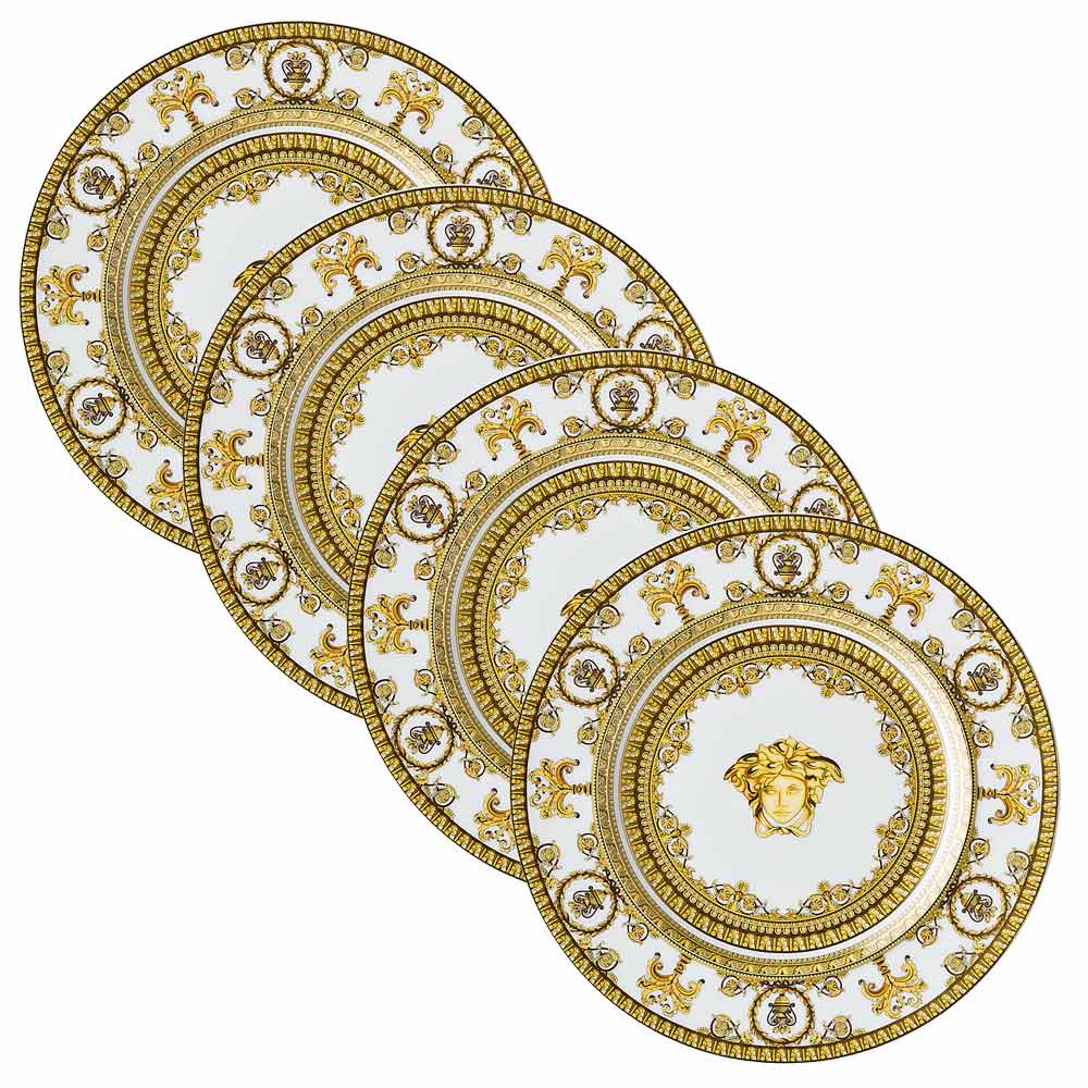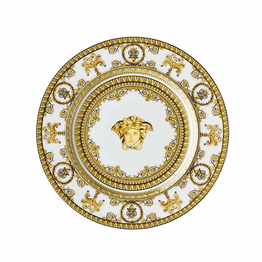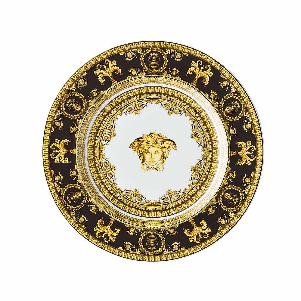 O Versace I Love Baroque Bread Plate , feito de porcelana fina , é uma ode à sofisticação e opulência atemporais típicas da casa. O design intrincado apresenta motivos barrocos dourados que se entrelaçam elegantemente em um fundo preto ou branco, criando um contraste que realça o icônico rosto da Medusa no centro. Cada detalhe é uma homenagem ao luxo e ao artesanato da Versace .