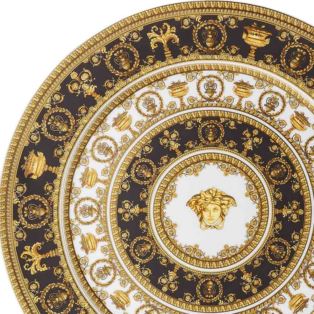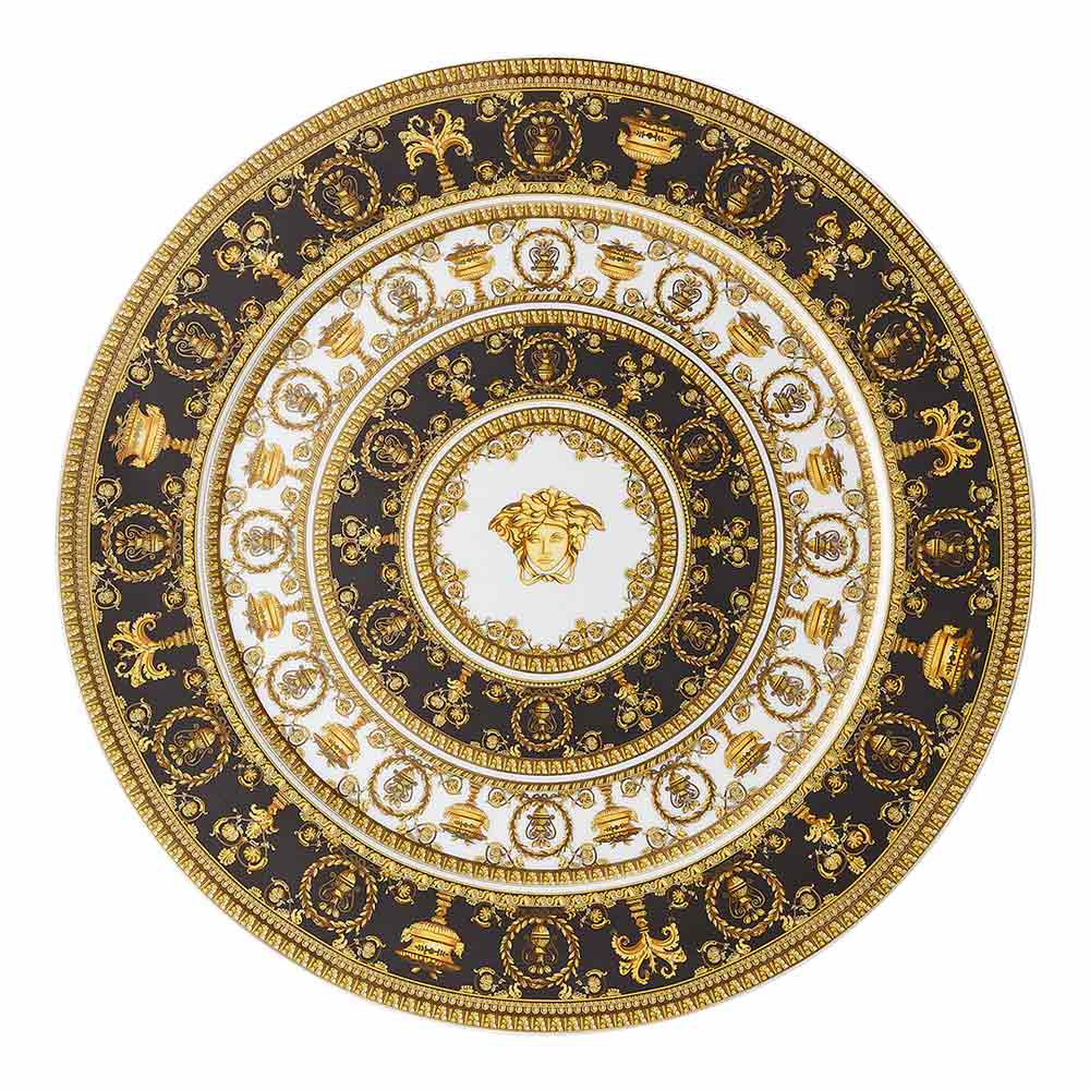 O jogo americano I Love Baroque da Versace , feito de porcelana preciosa , é uma verdadeira obra-prima de elegância e requinte atemporais . Seu design intrincado apresenta ricos detalhes barrocos dourados que se entrelaçam harmoniosamente em um fundo preto e branco, criando um efeito visual de luxo exclusivo. O rosto icônico da Medusa , o símbolo inconfundível da maison, se destaca no centro, emoldurado por motivos ornamentais que realçam sua realeza.