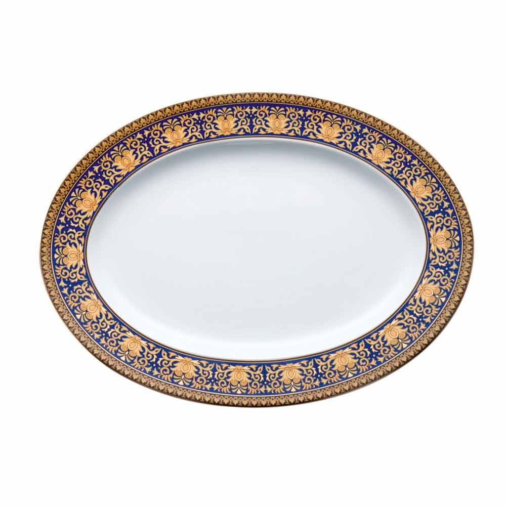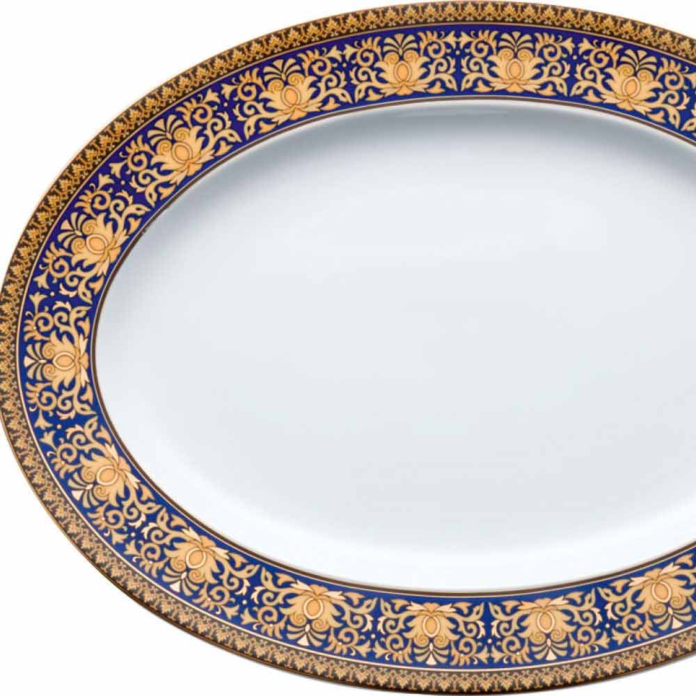 O fantástico e moderno prato oval de 34x24,5 cm desenhado pela Versace faz parte da elegante coleção moderna que, aliada a um glamour fascinante e refinado, remete a épocas passadas e se expressa no tom brilhante do azul e leva o nome de Medusa Blue.