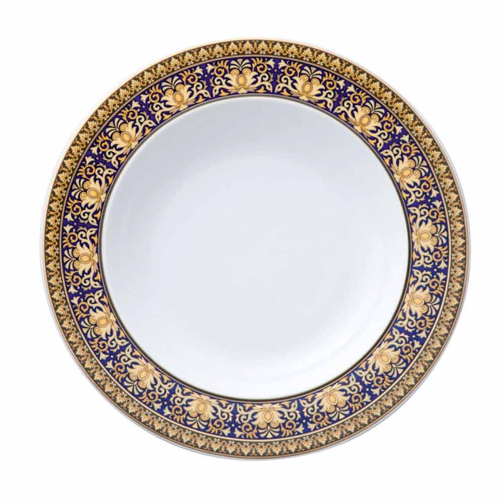 O prato de sopa de porcelana de 22 cm da Versace com design exclusivo faz parte da elegante coleção moderna que, combinada com um glamour fascinante e refinado, relembra épocas passadas e se expressa em tons de azul brilhante e leva o nome de Medusa Blue.