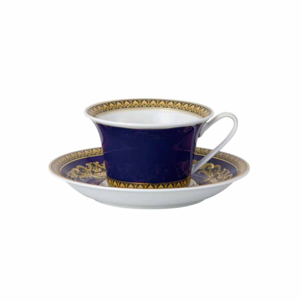 A elegante xícara de chá com pires da Versace faz parte da elegante coleção moderna que, combinada com um glamour fascinante e refinado, relembra épocas passadas e se expressa no tom brilhante do azul e leva o nome de Medusa Blue.