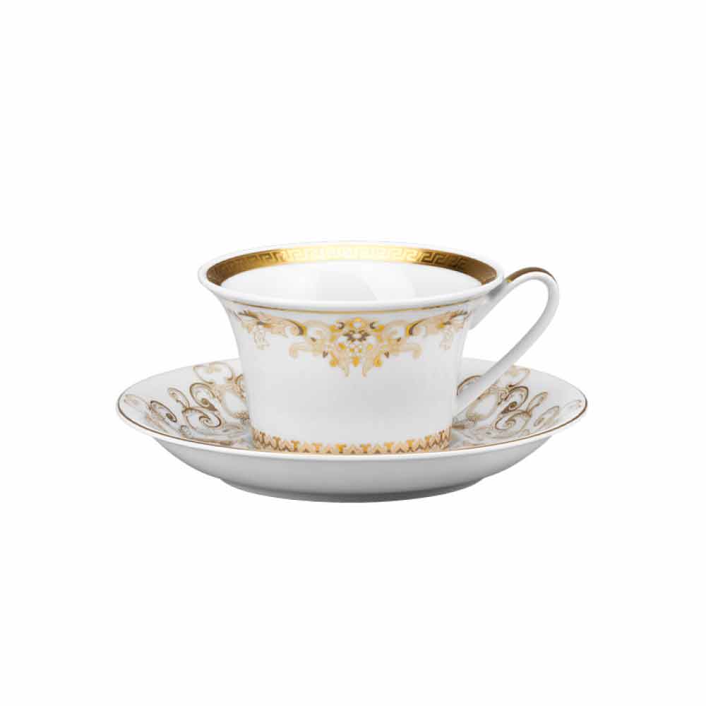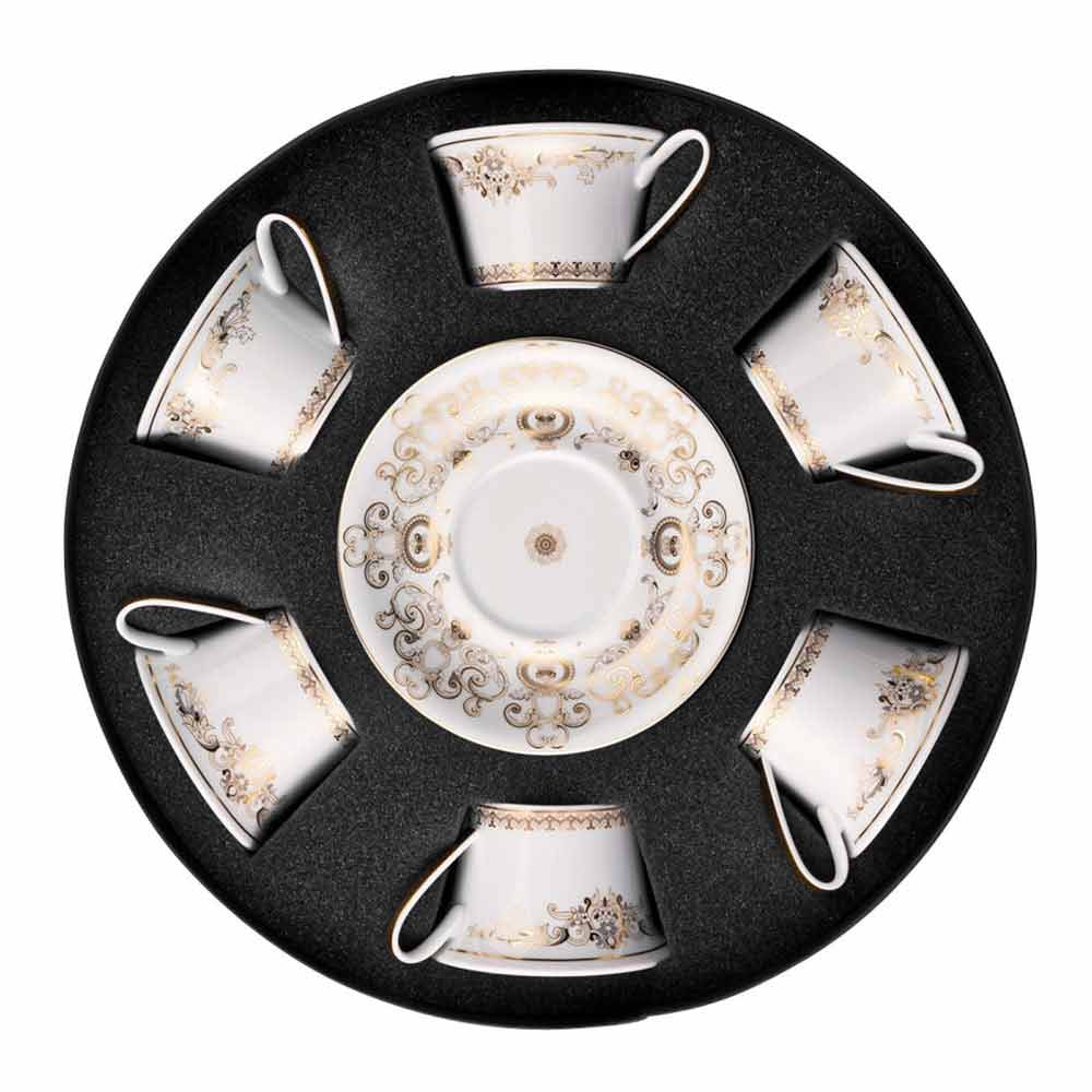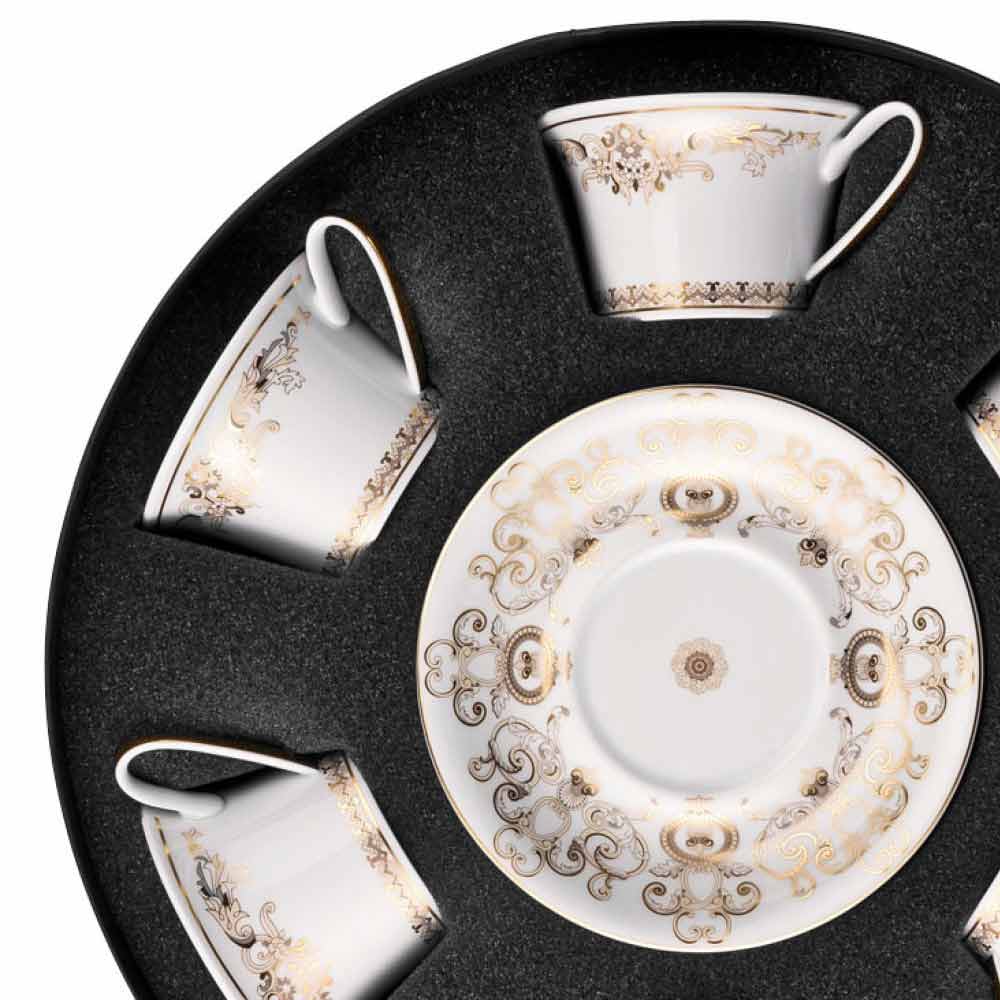 Neste conjunto de 6 xícaras de chá todo o requinte e luxo da nova coleção de louças Medusa Gala está incluída, que reinterpreta os motivos tradicionais da Versace em seu design e decoração: o ícone representando a Medusa alterna com refinados ornamentos barrocos em uma preciosa filigrana de ouro. Um efeito emocionante de contrastes entre a brancura da porcelana e o ouro puro cria uma mise en place perfeita, moderna e ao mesmo tempo única.