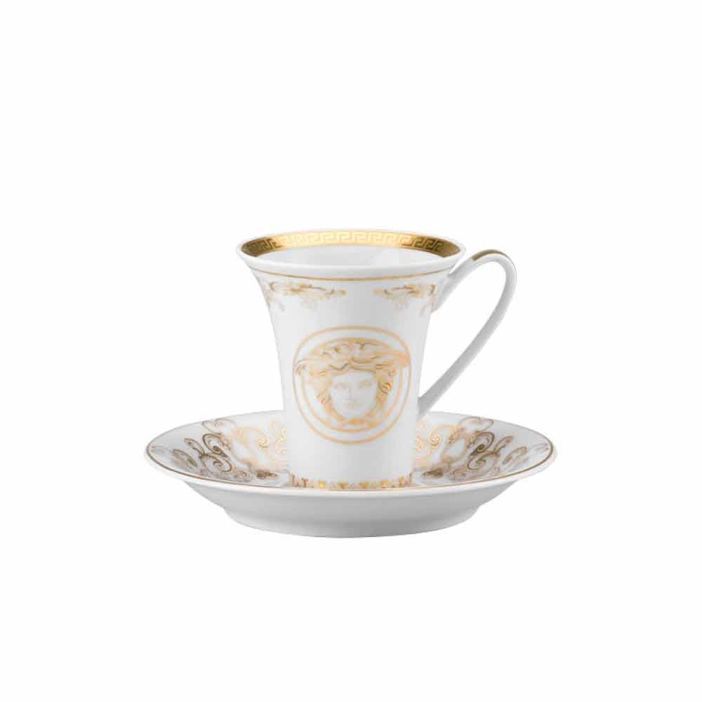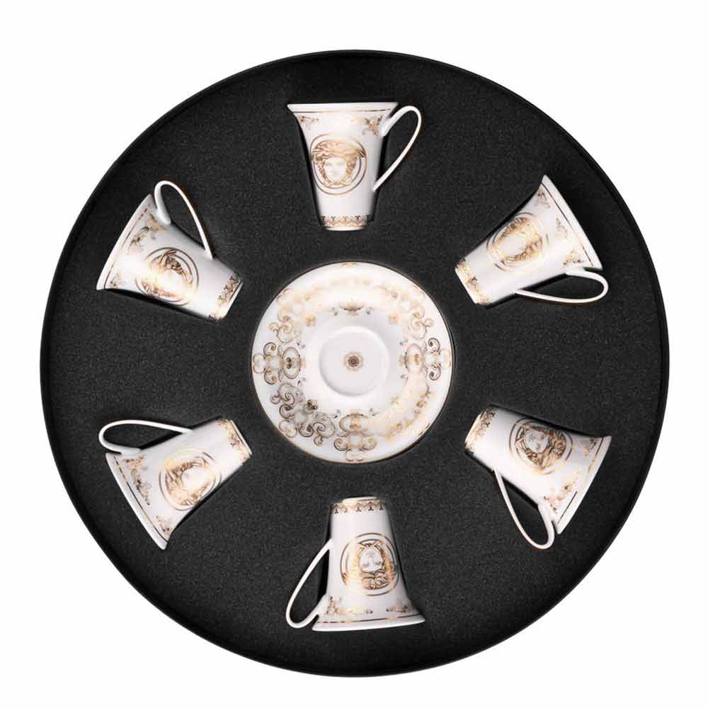 Neste conjunto de 6 xícaras todo o requinte e luxo da nova coleção de louças Medusa Gala estão incluídos, que reinterpreta os motivos tradicionais da Versace em design e decoração: o ícone representando a Medusa alterna com refinados ornamentos barrocos em uma preciosa filigrana de ouro. Um efeito emocionante de contrastes entre a candura da porcelana e o ouro puro dá vida a uma mise en place perfeita, moderna e ao mesmo tempo singular.