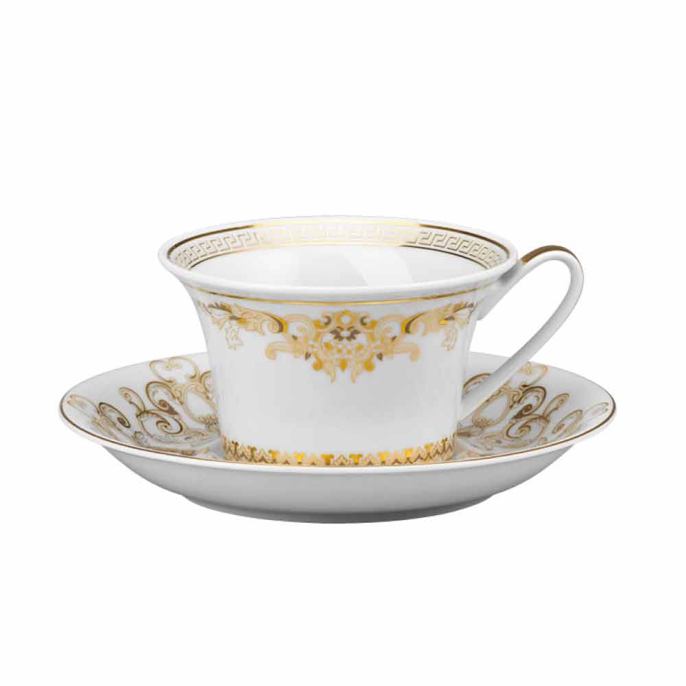 Este conjunto de 6 xícaras de chá contém todo o requinte e luxo da nova coleção de louças Medusa Gala , que reinterpreta os motivos tradicionais da Versace em seu design e decoração: o ícone representando Medusa alterna com refinados ornamentos barrocos em uma preciosa filigrana. ouro. Um emocionante efeito contrastante entre a brancura da porcelana e o ouro puro dá vida a uma mise en place perfeita, moderna e ao mesmo tempo singular.