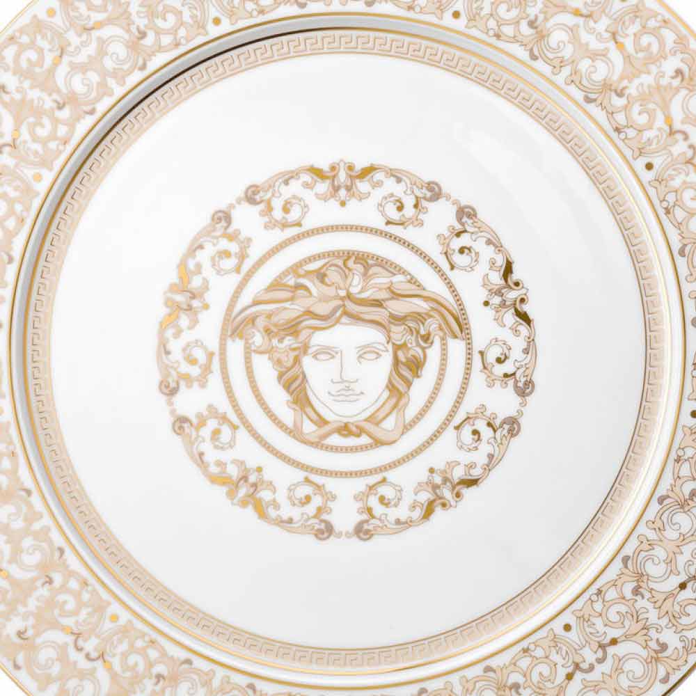 Inspirado pela opulência e atmosfera única dos jantares de gala, Medusa Gala reinterpreta os motivos tradicionais da Versace em design e decoração: a representação icônica da Medusa alterna com ornamentos barrocos refinados em uma preciosa filigrana de ouro. Um efeito contrastante emocionante entre a brancura da porcelana e o ouro puro dá vida a uma mise en place perfeita, moderna e ao mesmo tempo única.