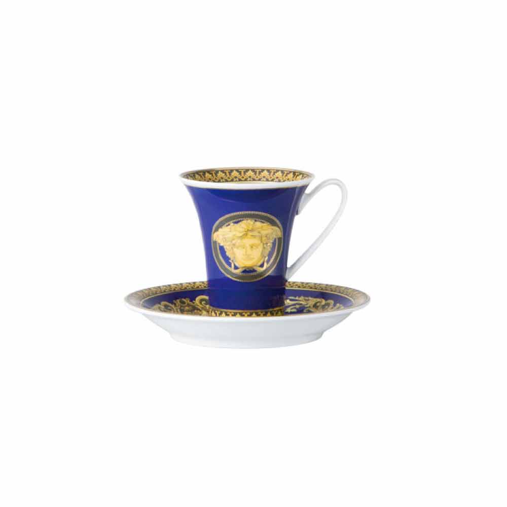 A elegante xícara de café com pires da Versace faz parte da elegante coleção moderna que, combinada com um glamour fascinante e refinado, relembra épocas passadas e se expressa no tom brilhante do azul e leva o nome de Medusa Blue.