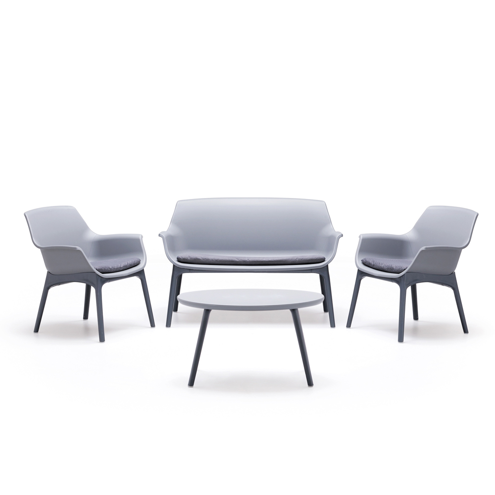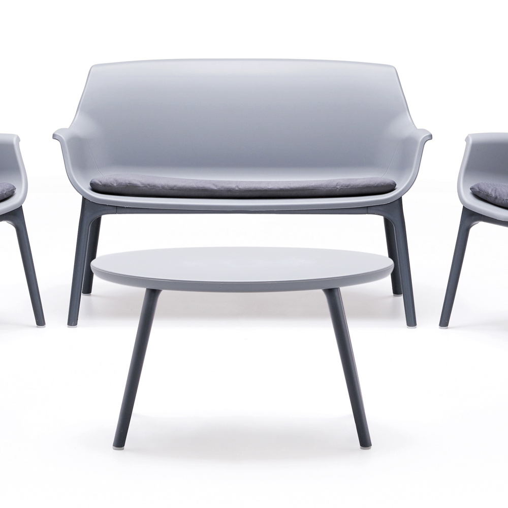 A mesa central, também em polipropileno, é perfeita para guardar bebidas, livros ou um elegante arranjo de flores. A paleta de cores neutras e a textura sofisticada adaptam-se harmoniosamente a qualquer ambiente exterior, desde o jardim moderno ao terraço urbano.