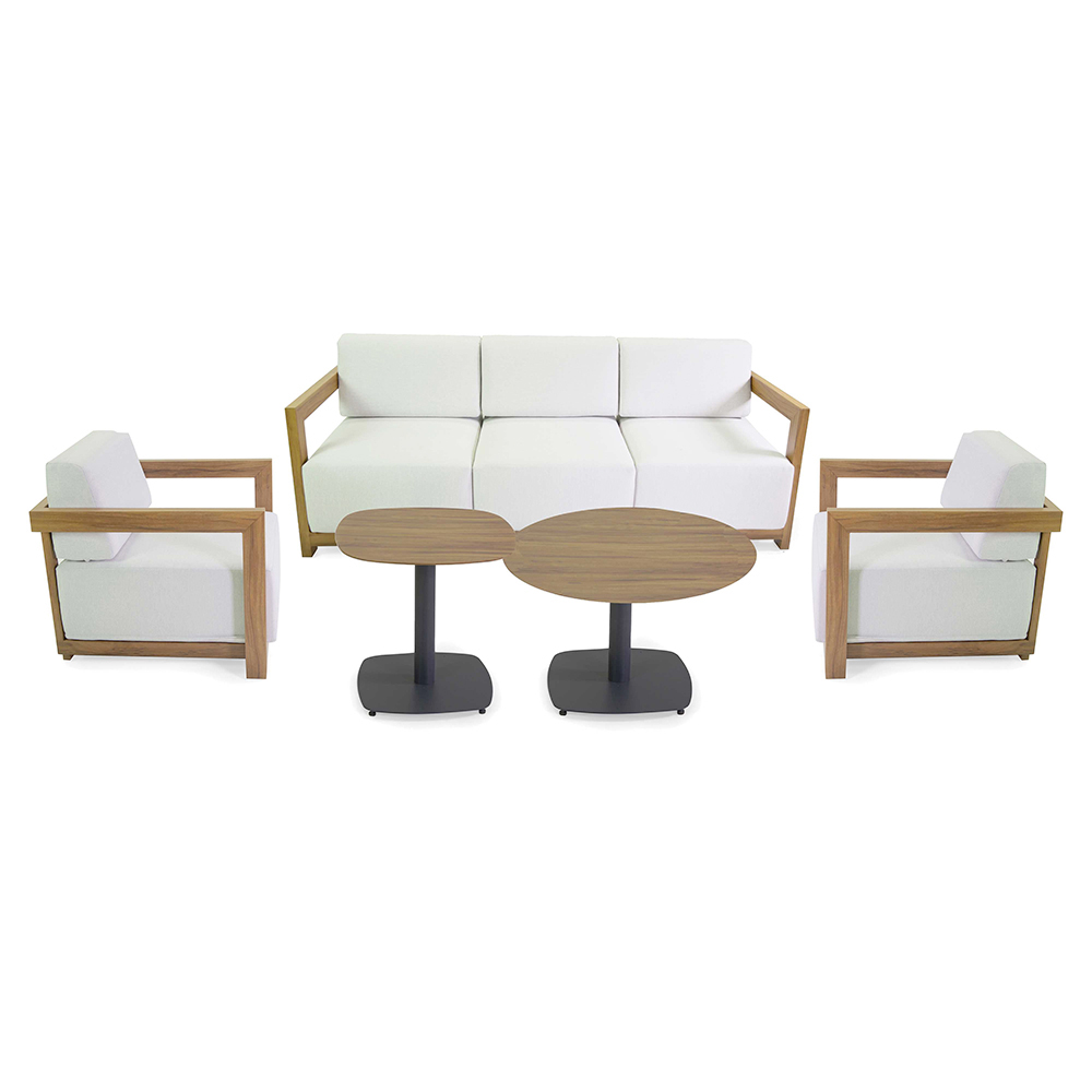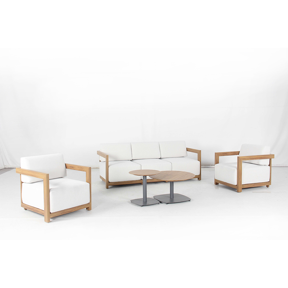 Este lounge set é a personificação da elegância contemporânea, perfeita para criar uma atmosfera acolhedora e refinada em qualquer espaço ao ar livre. Cada peça combina linhas limpas e materiais de alta qualidade , com uma estrutura de madeira robusta e almofadas aconchegantes em tecido resistente às intempéries, garantindo conforto duradouro e manutenção mínima.