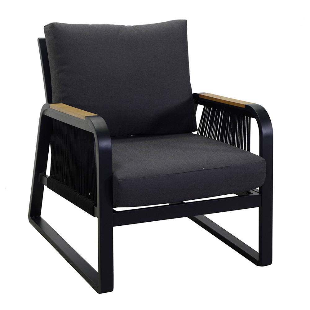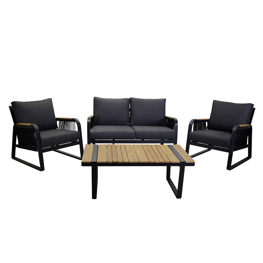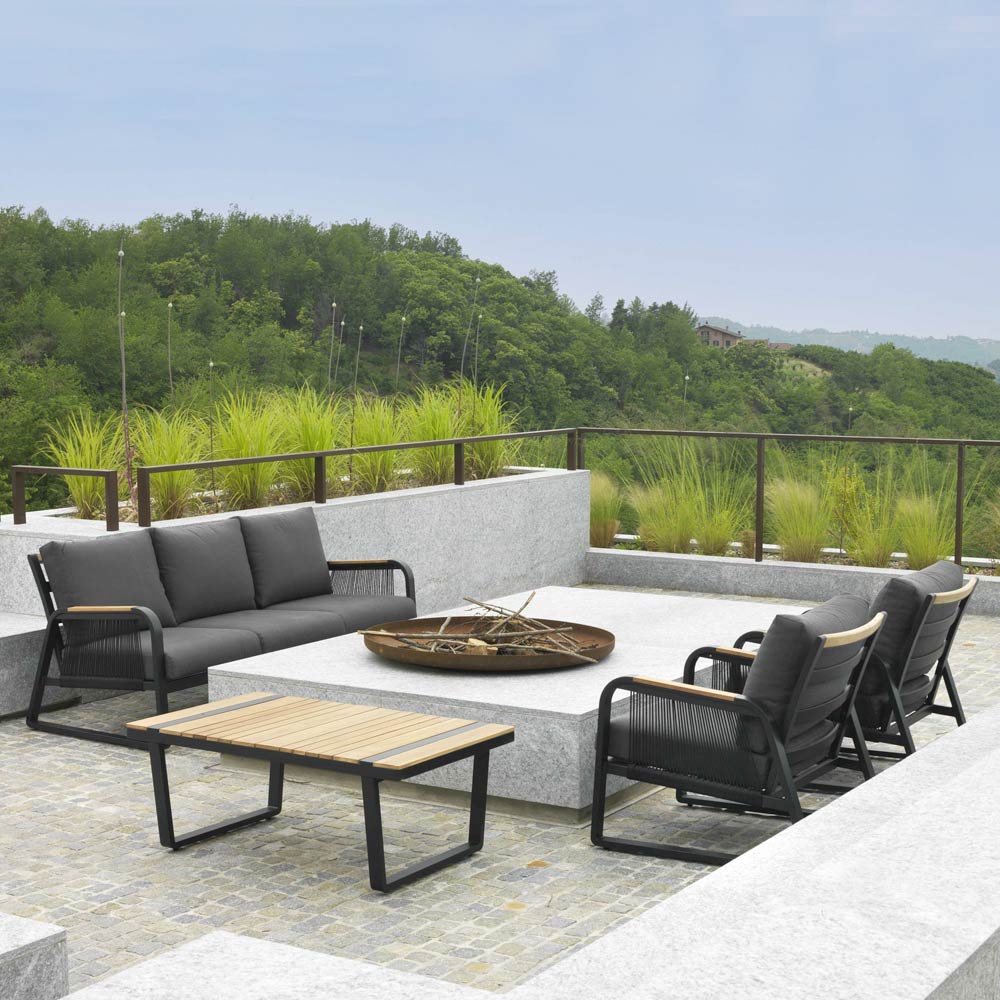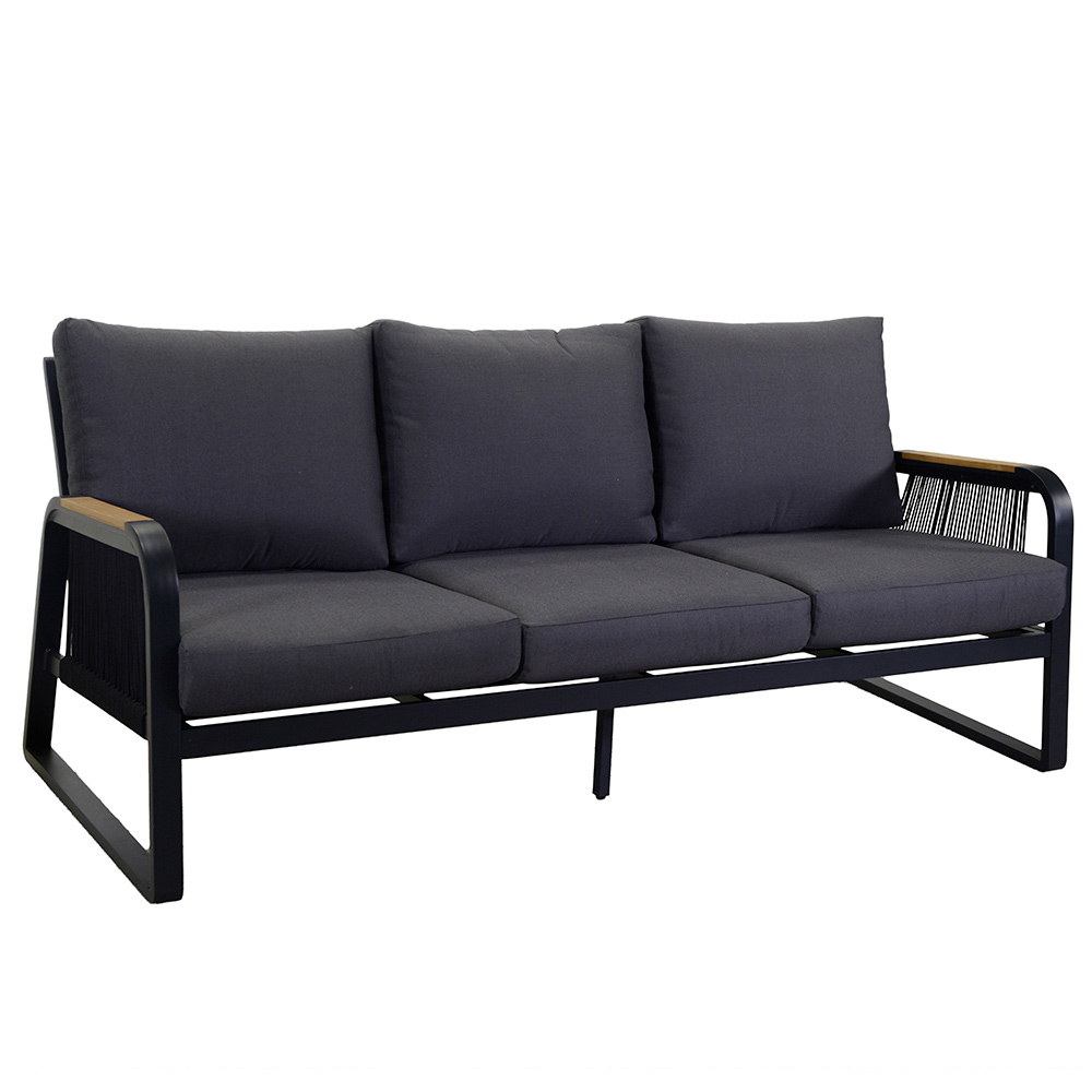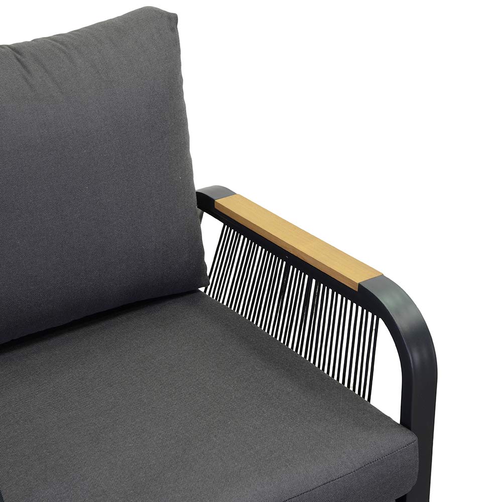 1 sofá: estrutura em alumínio revestido a pó anti-ferrugem na cor antracite, cordas em poliéster tecido na cor antracite, almofadas repelentes de água em poliéster cinzento escuro, capas amovíveis e apoios de braços em madeira TEAK do Brasil