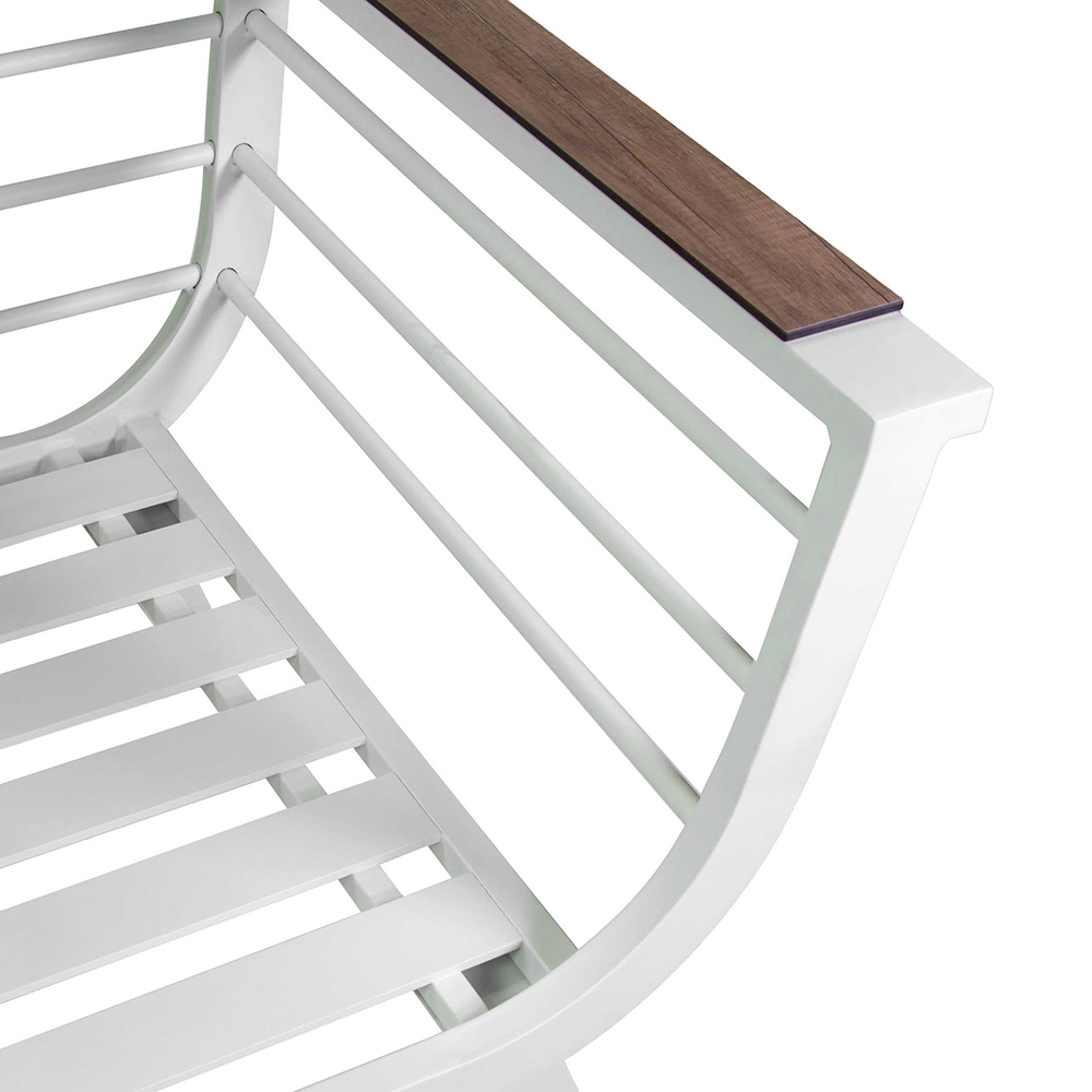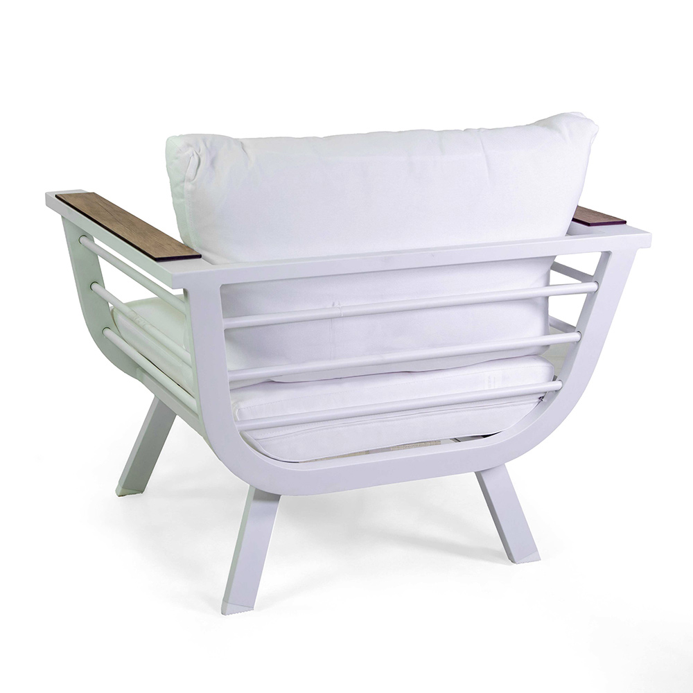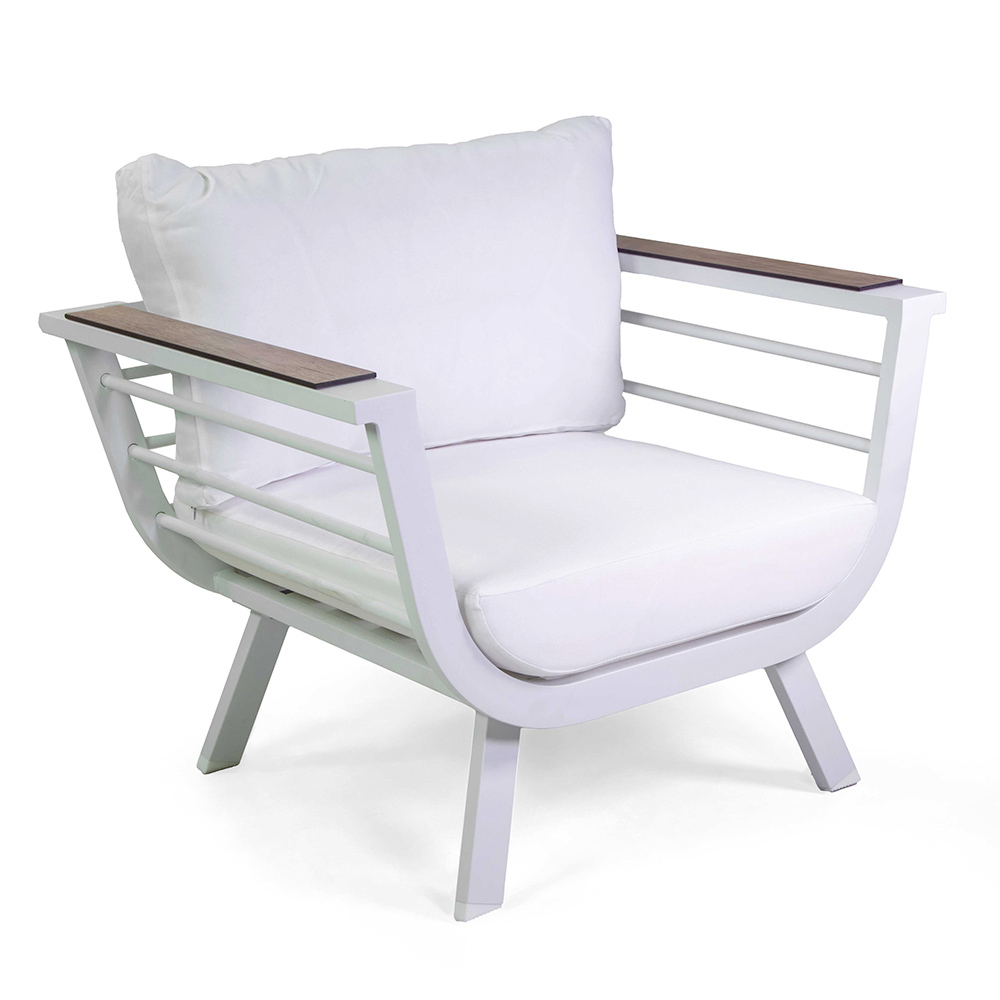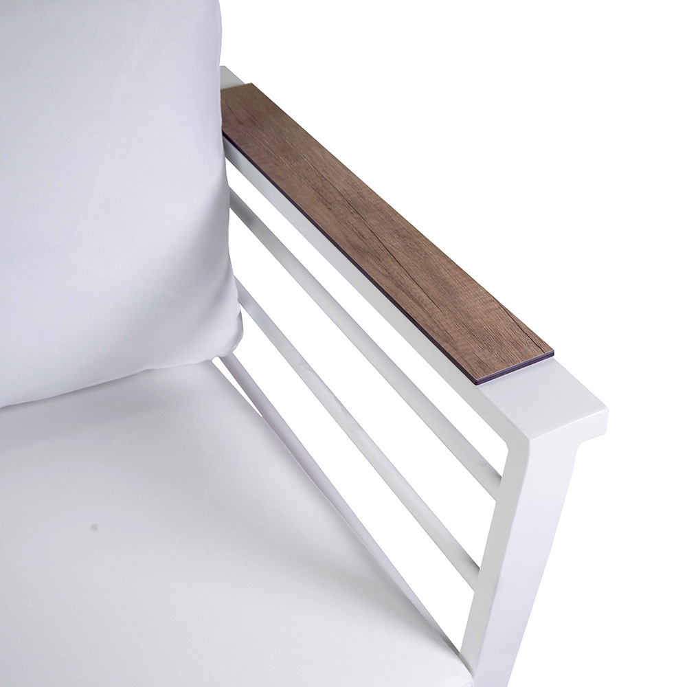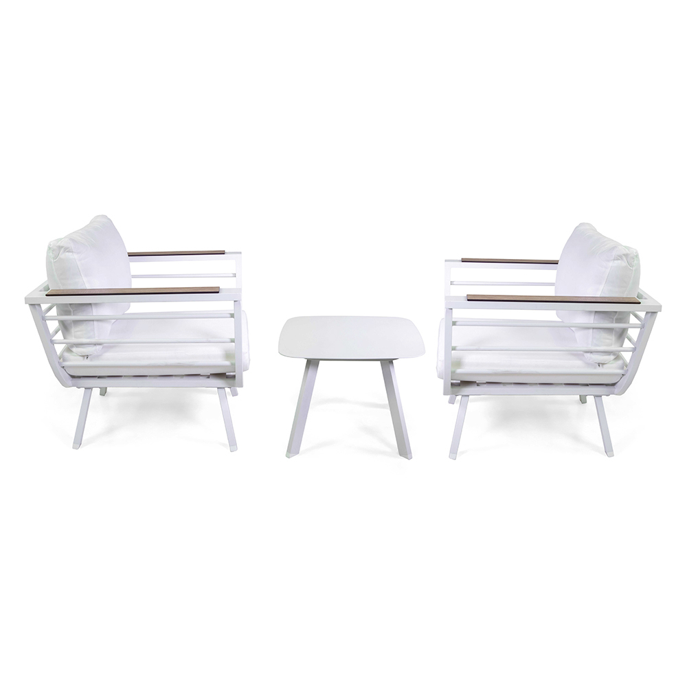 Descubra a elegância e o conforto modernos com este conjunto de lounge de alumínio revestido a pó . Perfeito para adicionar um toque de classe ao seu espaço ao ar livre, este conjunto inclui duas poltronas com almofadas removíveis de 12 cm de espessura em tecido Olifen 100% repelente à água, garantindo conforto e durabilidade. Os apoios de braço em HPL dão um toque de estilo e praticidade, enquanto a mesa com tampo em alumínio branco é resistente e fácil de manter.