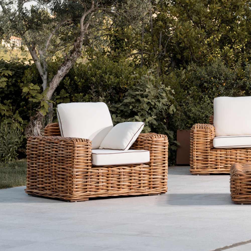 Lounge set ao ar livre em rattan natural com almofadas incluídas.