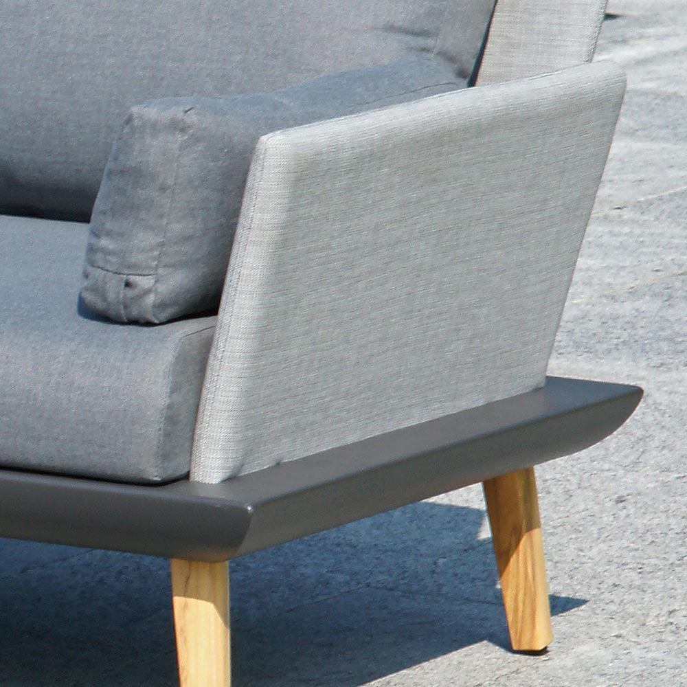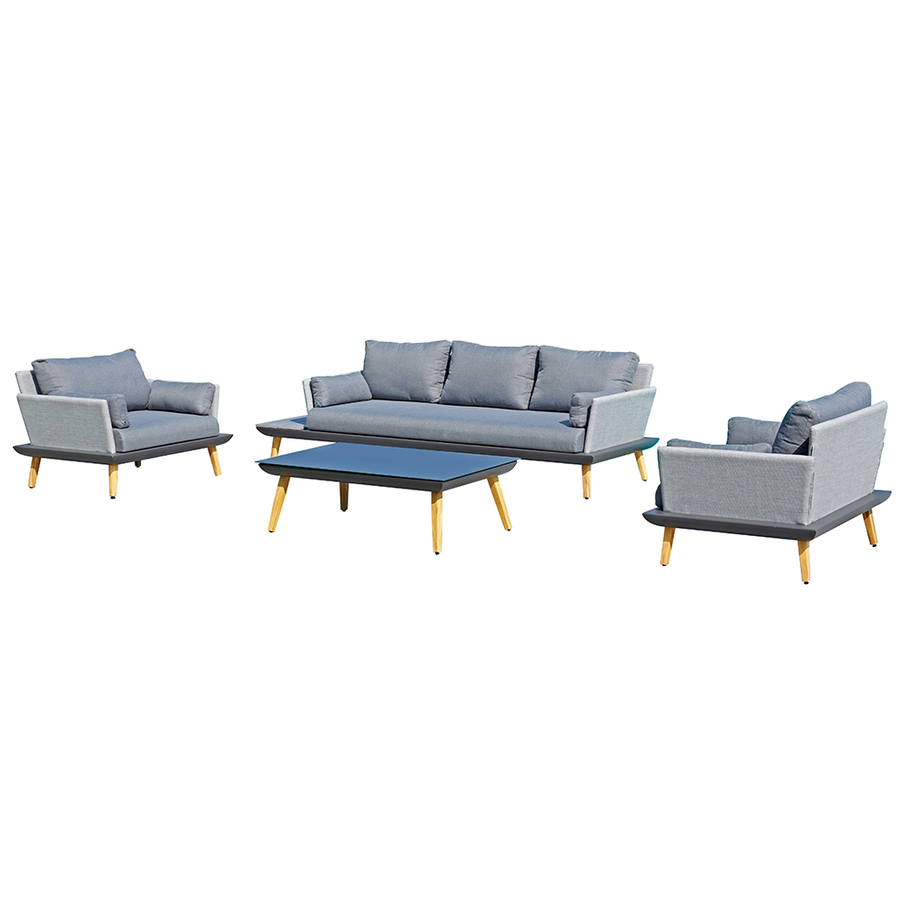Salão exterior composto por 2 poltronas e um sofá de 3 lugares equipado com uma mesa de apoio prática com tampo em madeira resinada revestido