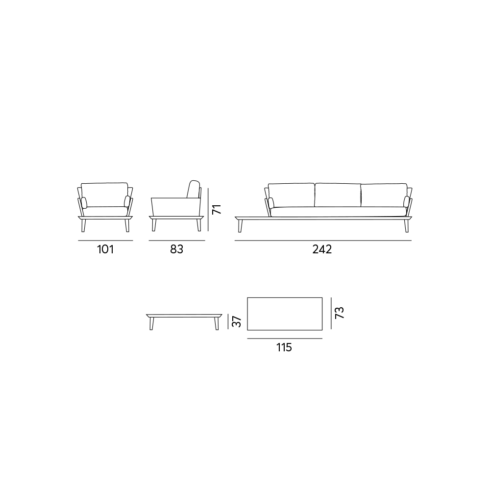 - sofá de três lugares: L 242 x P 83 x A 71 cm;