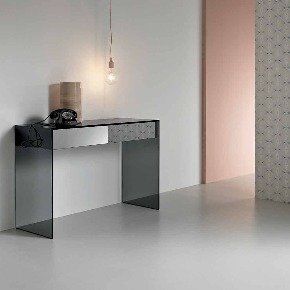 Mesa consolada moderna feita à mão na Itália em vidro smokey com gaveta de madeira.