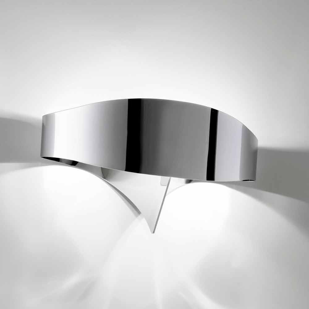 Lâmpada de parede criada a partir de uma faixa de aço de corte a laser dobrada à mão, a fim de criar um elemento indiviso e envolvente.