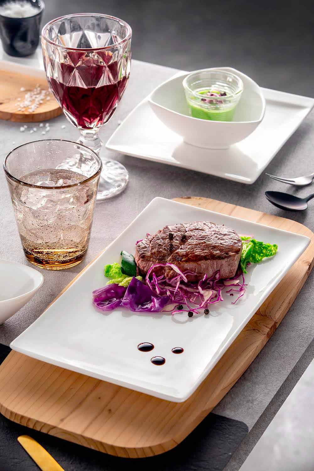 beleza das formas que a compõem. O estudo e a pesquisa de formulários foram direcionados para dar personalidade e originalidade à mise en table, para que ela possa ser notada e lembrada. Na proposta culinária multifacetada e vasta, agora está estabelecido que a diferenciação é essencial e o primeiro impacto é dado precisamente pela mise en table e pela apresentação "estética" de suas propostas culinárias. O serviço atende a esse objetivo: a
