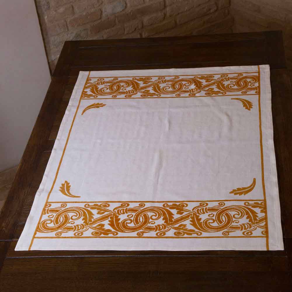 Serviço de café da manhã artesanal (Individual e 2 guardanapos) em linho puro com estampa artística em tecidos antigos decorados à mão, disponível em três variantes, uma peça de qualidade única fabricada na Itália.