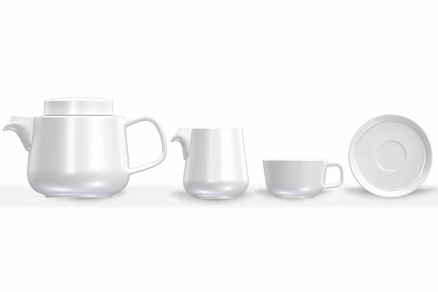 Serviço de chá com xícaras, pires, bule e jarro de leite em porcelana de design de inspiração escandinava 14 peças.