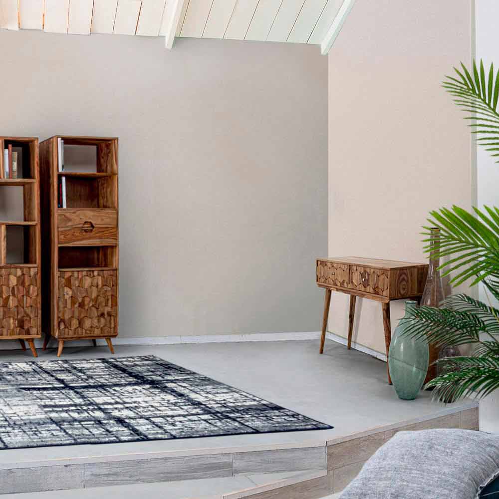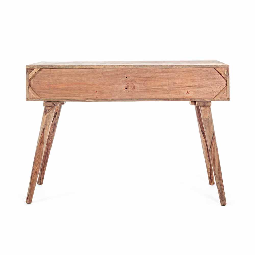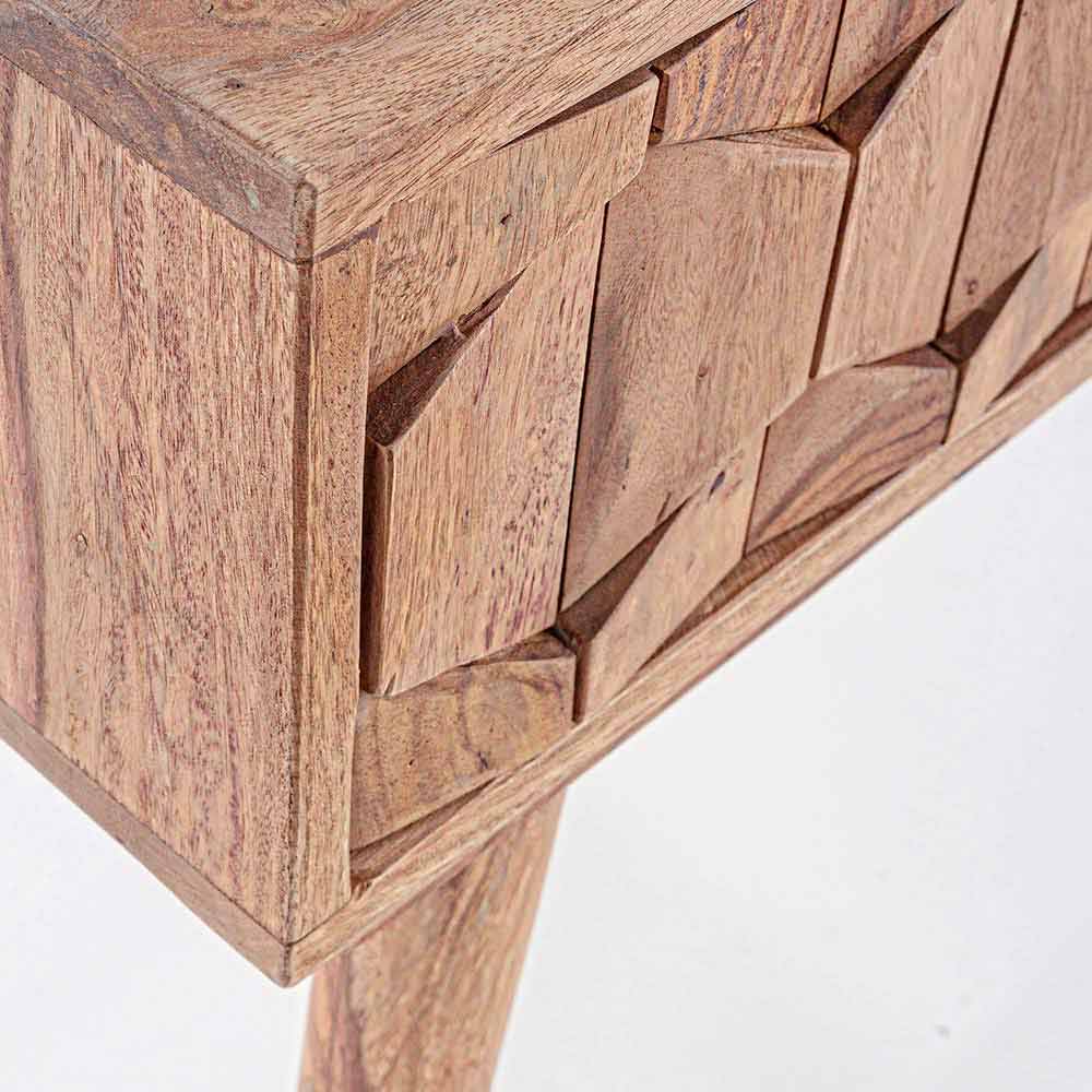 Este console de design é feito de madeira sheesham fina com acabamento natural. É uma madeira de espessura média conhecida pelo seu brilho natural; por isso e por sua durabilidade ao longo do tempo é ideal na produção de móveis. Desenhado com duas gavetas na parte traseira e no fundo em contraplacado com acabamento natural, enquanto a frente é decorada. Os elegantes puxadores de aço completam o cenário.