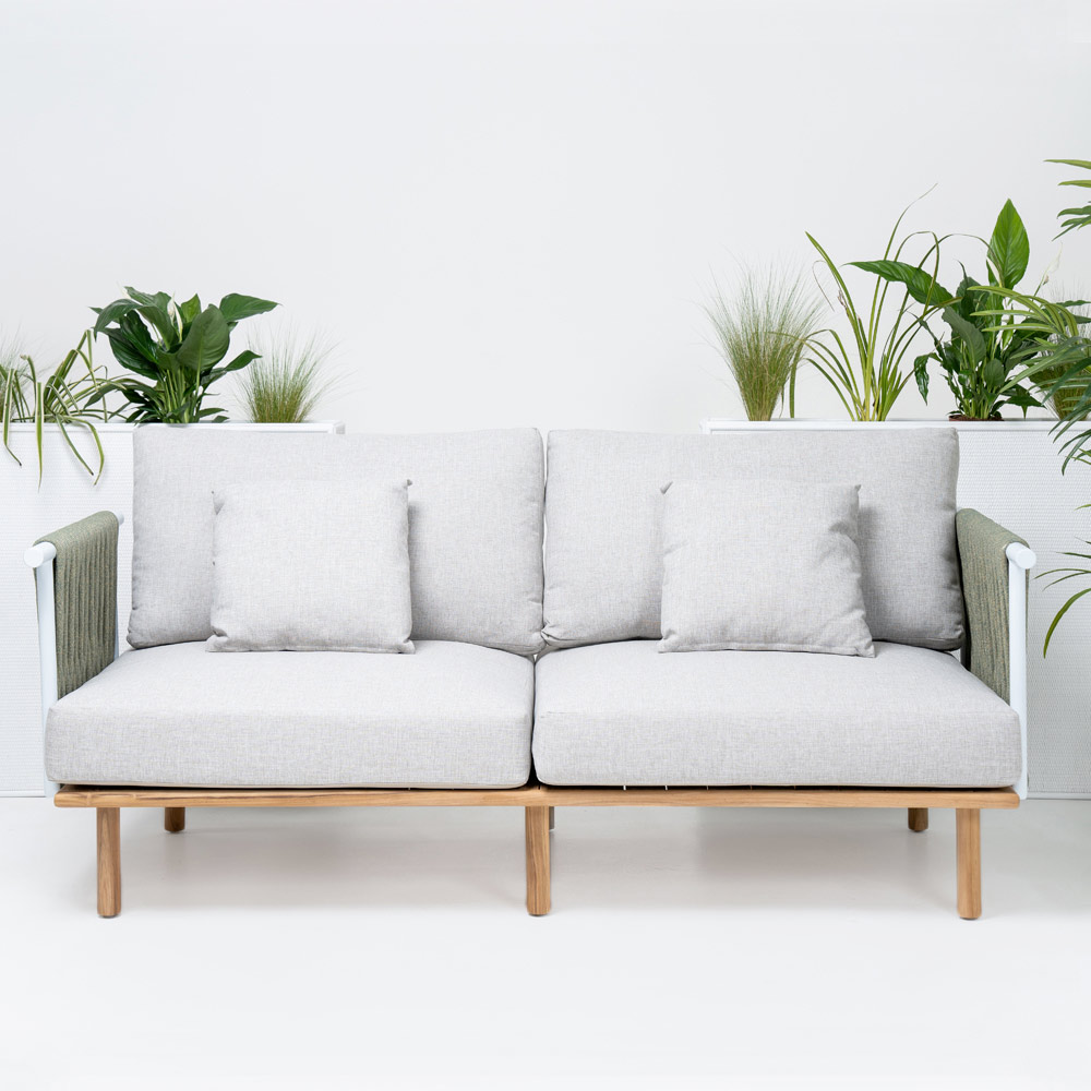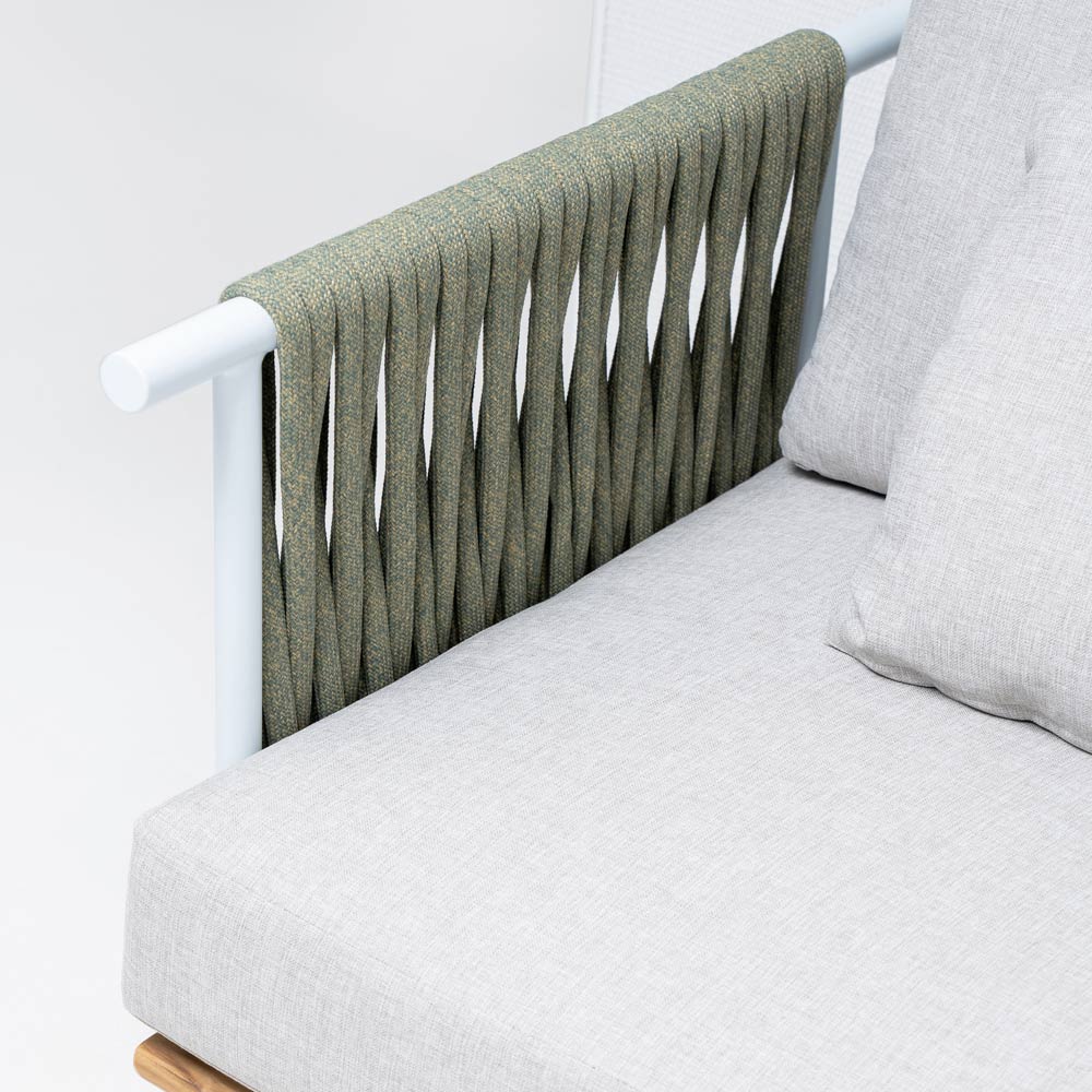 Sofá de jardim em teca, encostos em alumínio e tecido Olefin/PP ROPE e almofadas