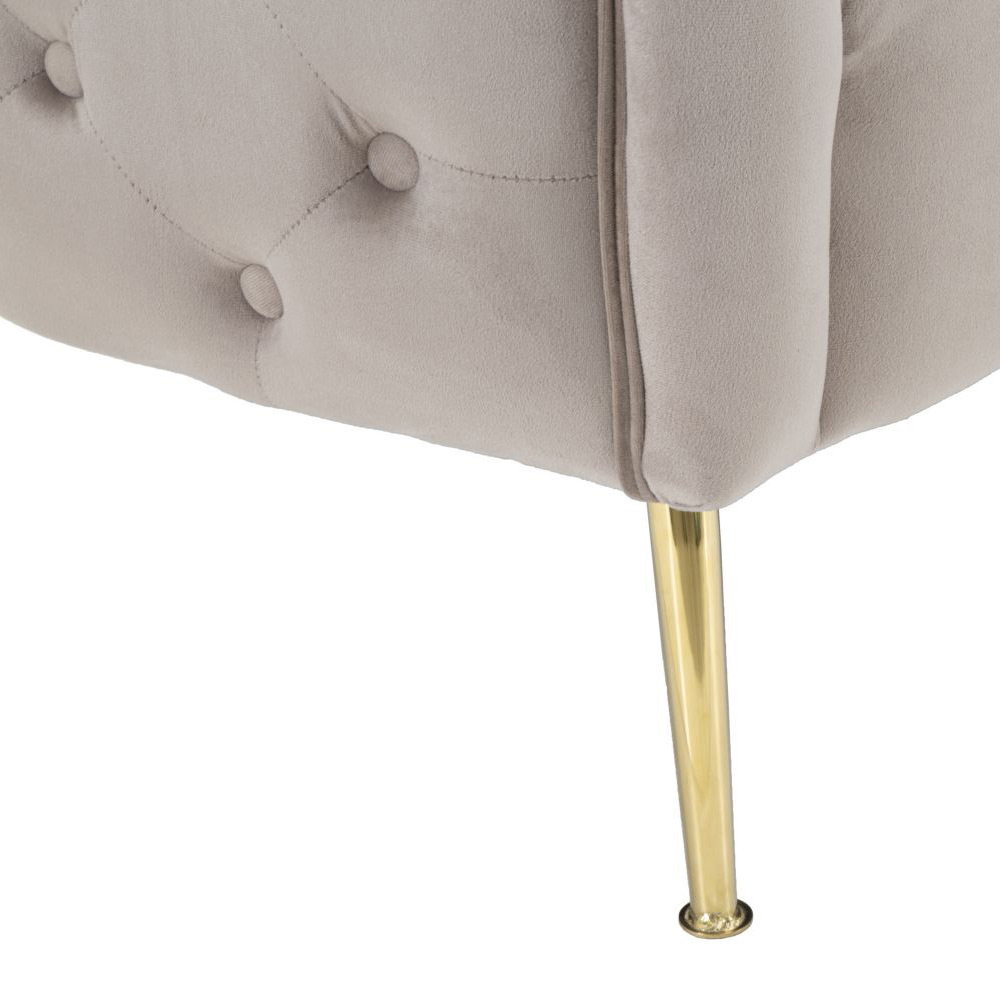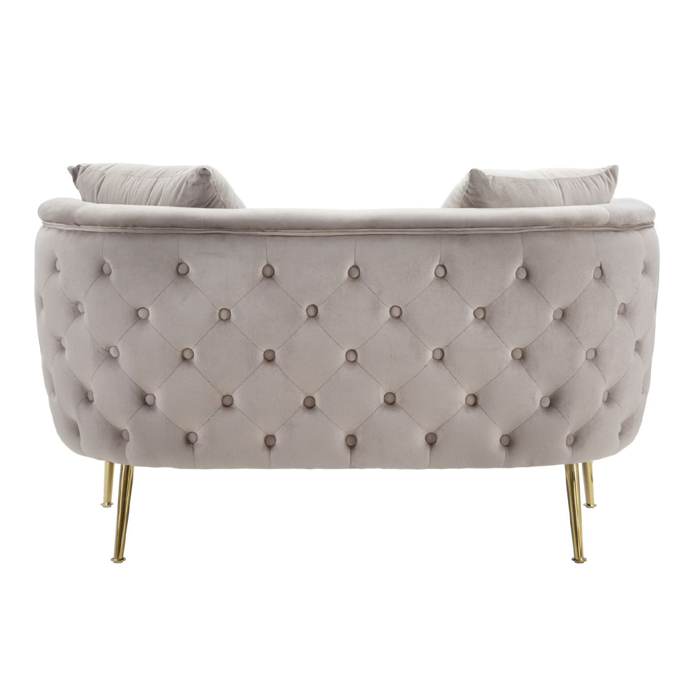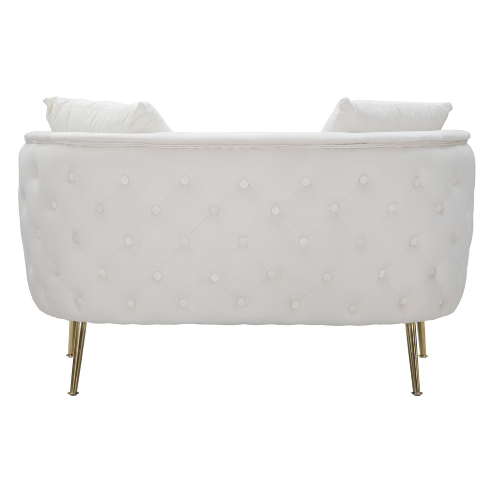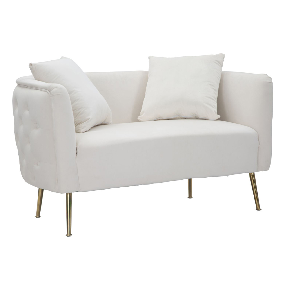Sofá 2 lugares estofado e forrado a veludo com pés de ferro dourado.
