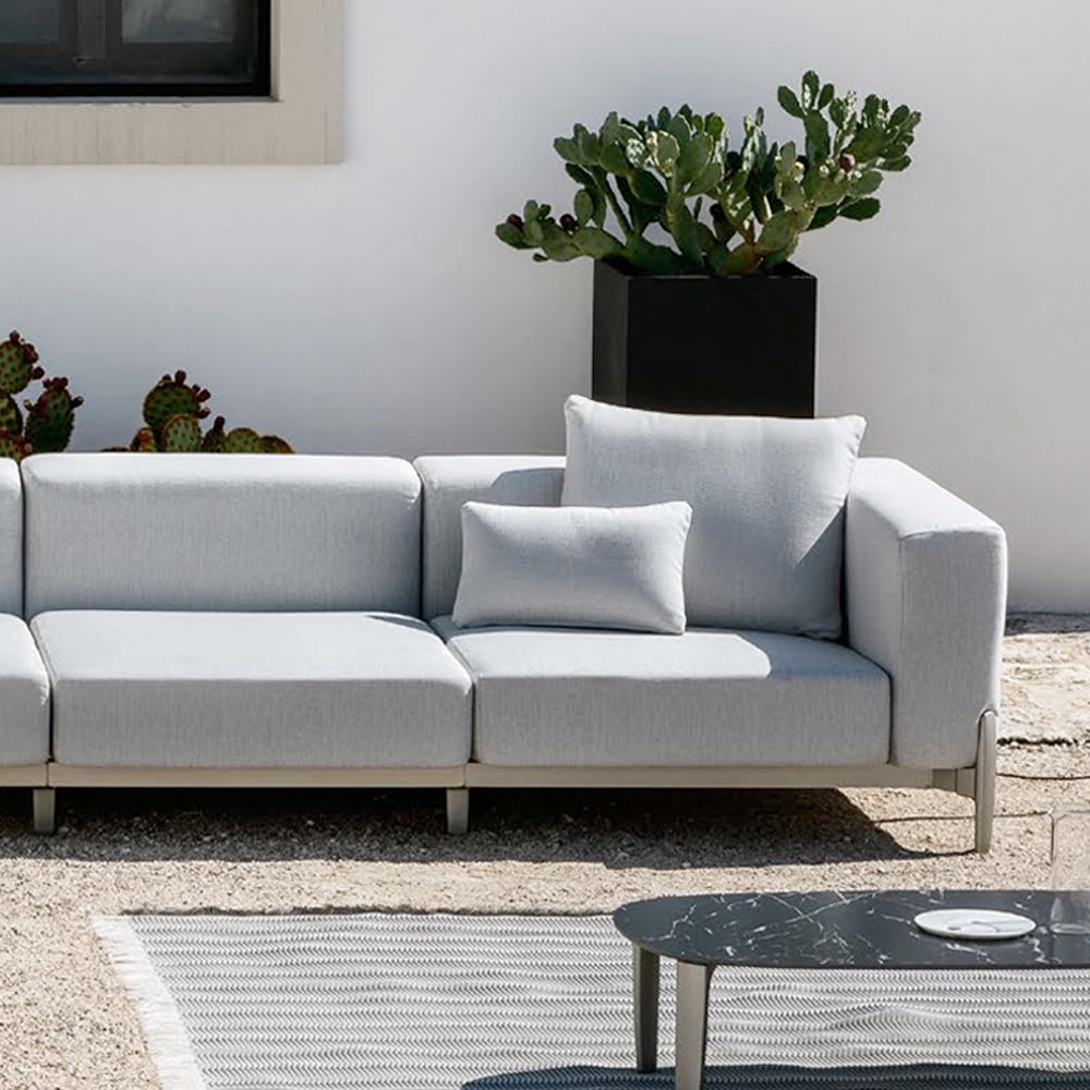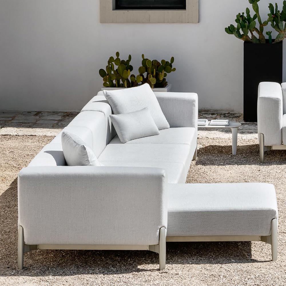 A coleção caracteriza-se pelo detalhe da perna de alumínio como ponto focal aliado ao rigor formal e modular do forro, para vivenciar o ar livre em termos de máximo relaxamento e convívio, sentado no sofá, à volta de uma mesa ou deitado no espreguiçadeira. .
