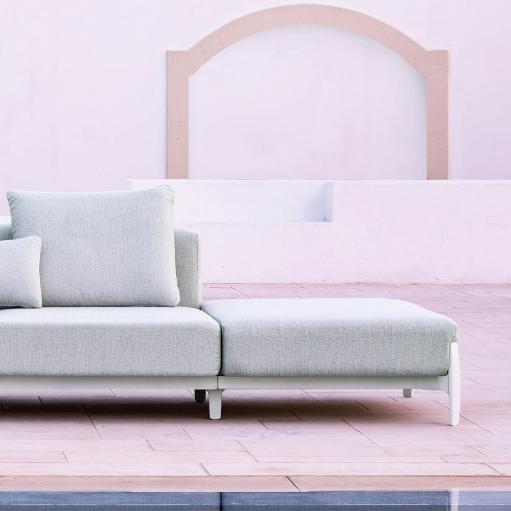 A coleção caracteriza-se pelo detalhe da perna de alumínio como ponto focal aliado ao rigor formal e modular do forro, para vivenciar o ar livre em termos de máximo relaxamento e convívio, sentado no sofá, à volta de uma mesa ou deitado no espreguiçadeira. .