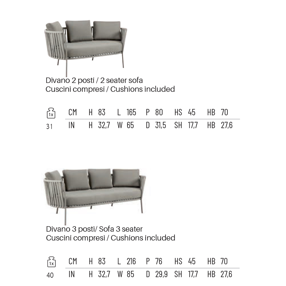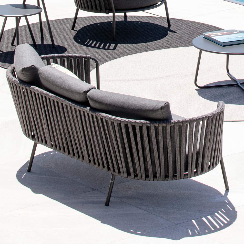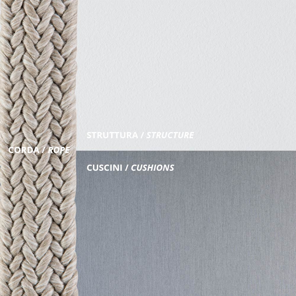 resistência do acabamento do material aos agentes atmosféricos corrosivos, enquanto a corda é resistente ao cloro e à luz solar, além de ser antimofo. As almofadas são feitas com material resistente aos raios UV e à água, que mantém a cor por muito tempo, tornando o sofá um elemento perfeito para mobiliar qualquer ambiente externo.
