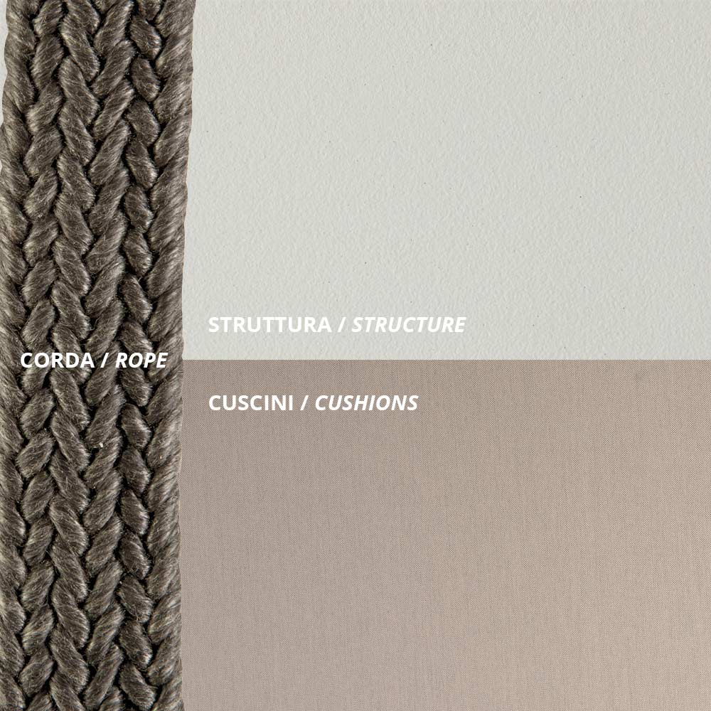 - Estrutura: branco em relevo + Corda: lama + Almofadas: cinza