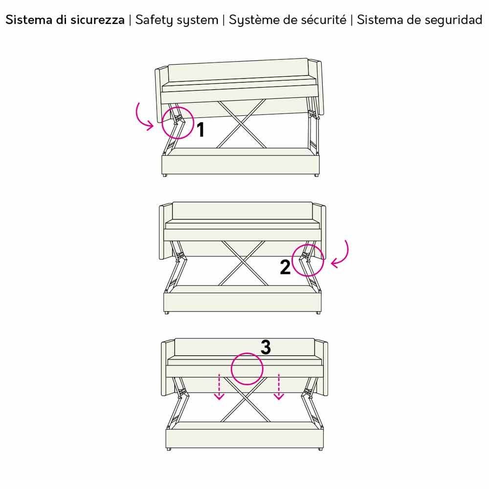 mecanismo de abertura fácil e rápido equipado com 3 níveis de segurança, ao passo que para fechá-lo basta libertar os dois apoios laterais, que ficarão bloqueados até que o batente central também seja desbloqueado. O sofá-cama também está equipado com uma prática escada e guarda-corpo lateral para uma garantia ainda maior de segurança.