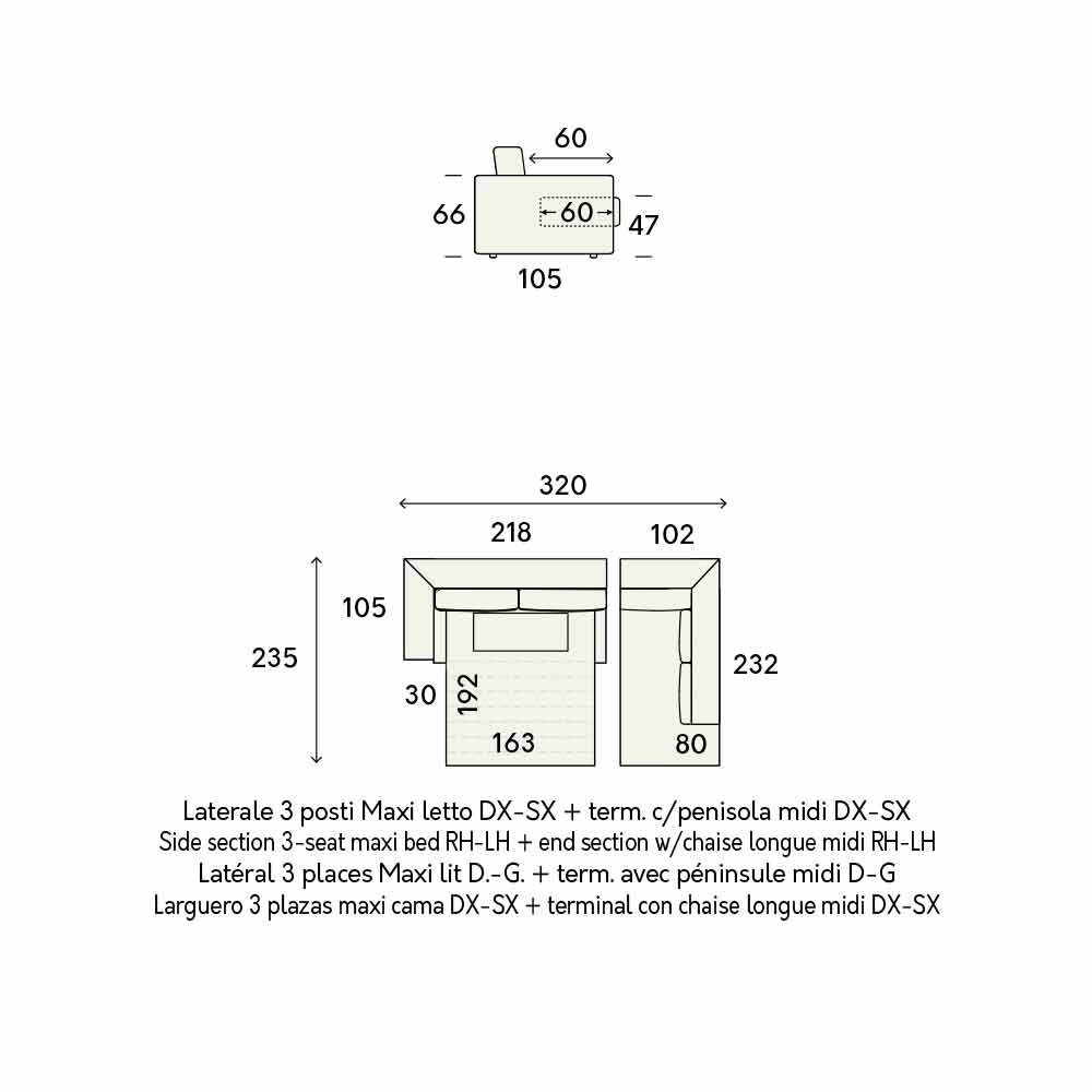 - L 320 x P 235 x H 85 cm (colchão: L 163 x P 192 x H 11 cm).