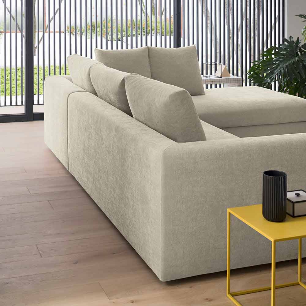 sofá de tamanho familiar extremamente elegante e acolhedor, enriquecido pela grande chaise longue que oferece o conforto ideal para desfrutar de noites maravilhosas com os amigos ou deixar-se mimar pelo abraço caloroso e suave do seu design acolhedor. Rápido e fácil de preparar, este sofá se transforma em uma