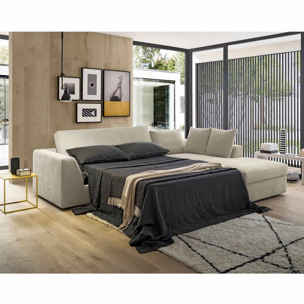 Sofá-cama de canto coberto de tecido bege feito na Itália