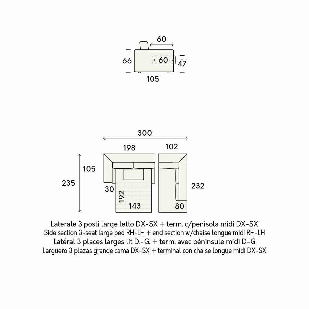 - L 300 x P 235 x H 85 cm (colchão: L 143 x P 192 x H 11 cm):