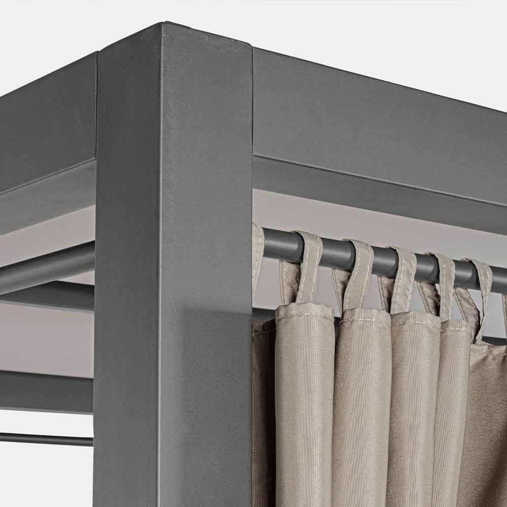 Estrutura em alumínio revestido a pó, postes de 80x80mm, tecido de tejadilho e almofadas de assento (amovíveis) em
