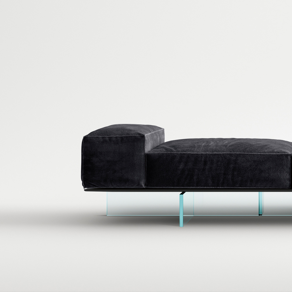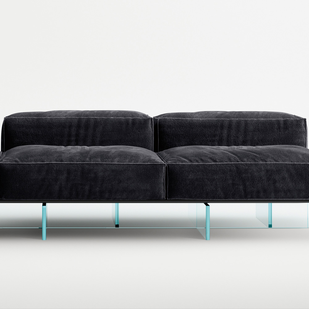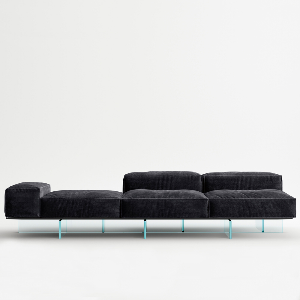 Composto por volumes macios e generosamente acolchoados, o sistema de assentos introduz uma nova forma de conceber o espaço habitacional, com elementos que permitem composições originais, mais dinâmicas e informais. O sofá mantém a leveza visual graças à base composta por pés de vidro laminado que sustentam uma plataforma de madeira sobre a qual repousam os elementos estofados. Tecidos sofisticados de alta qualidade e detalhes refinados nas embalagens são os diferenciais de um projeto de caráter nada convencional.