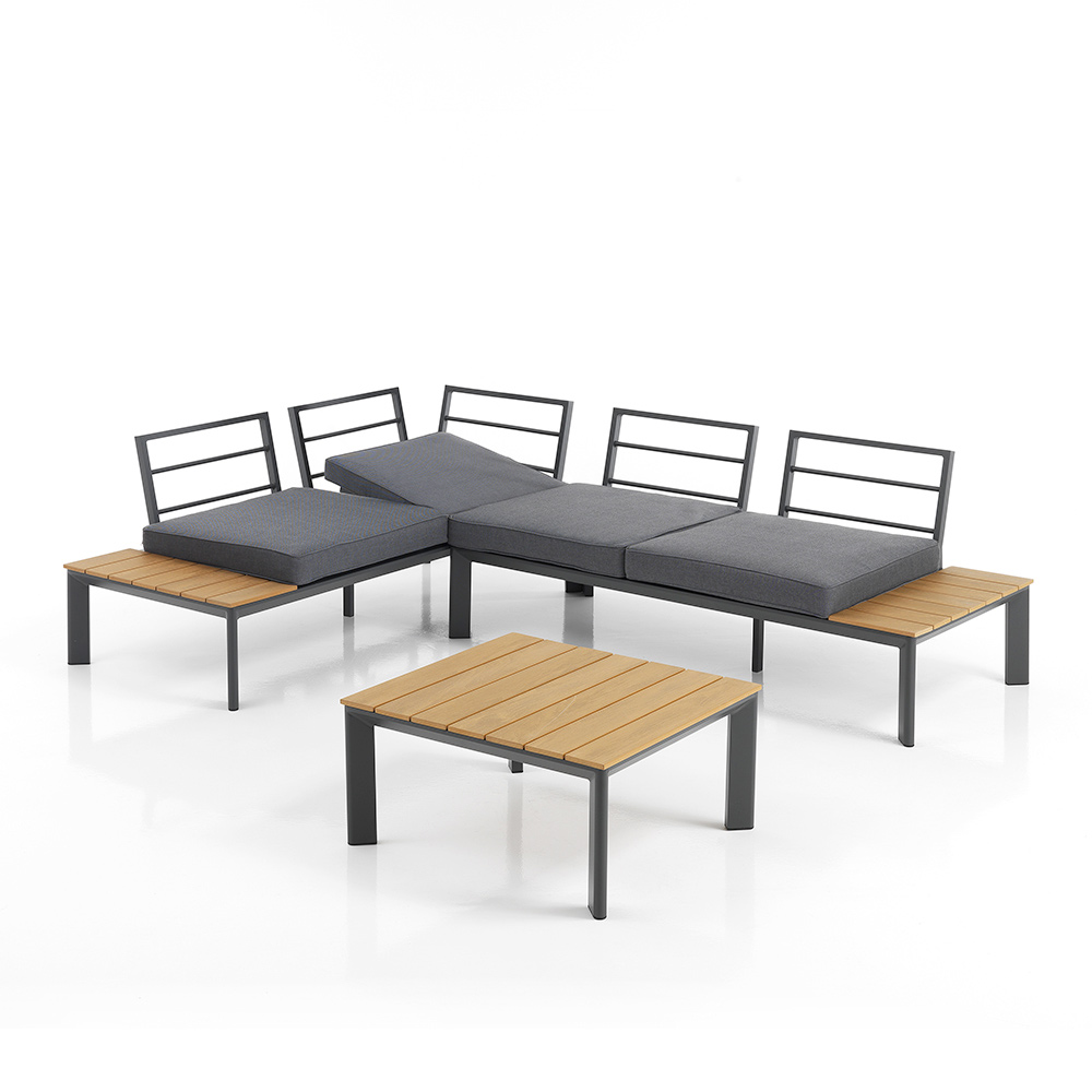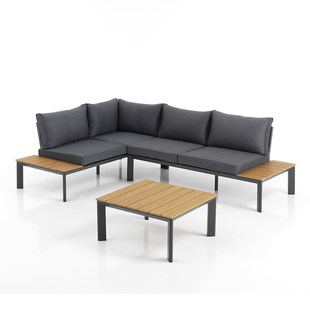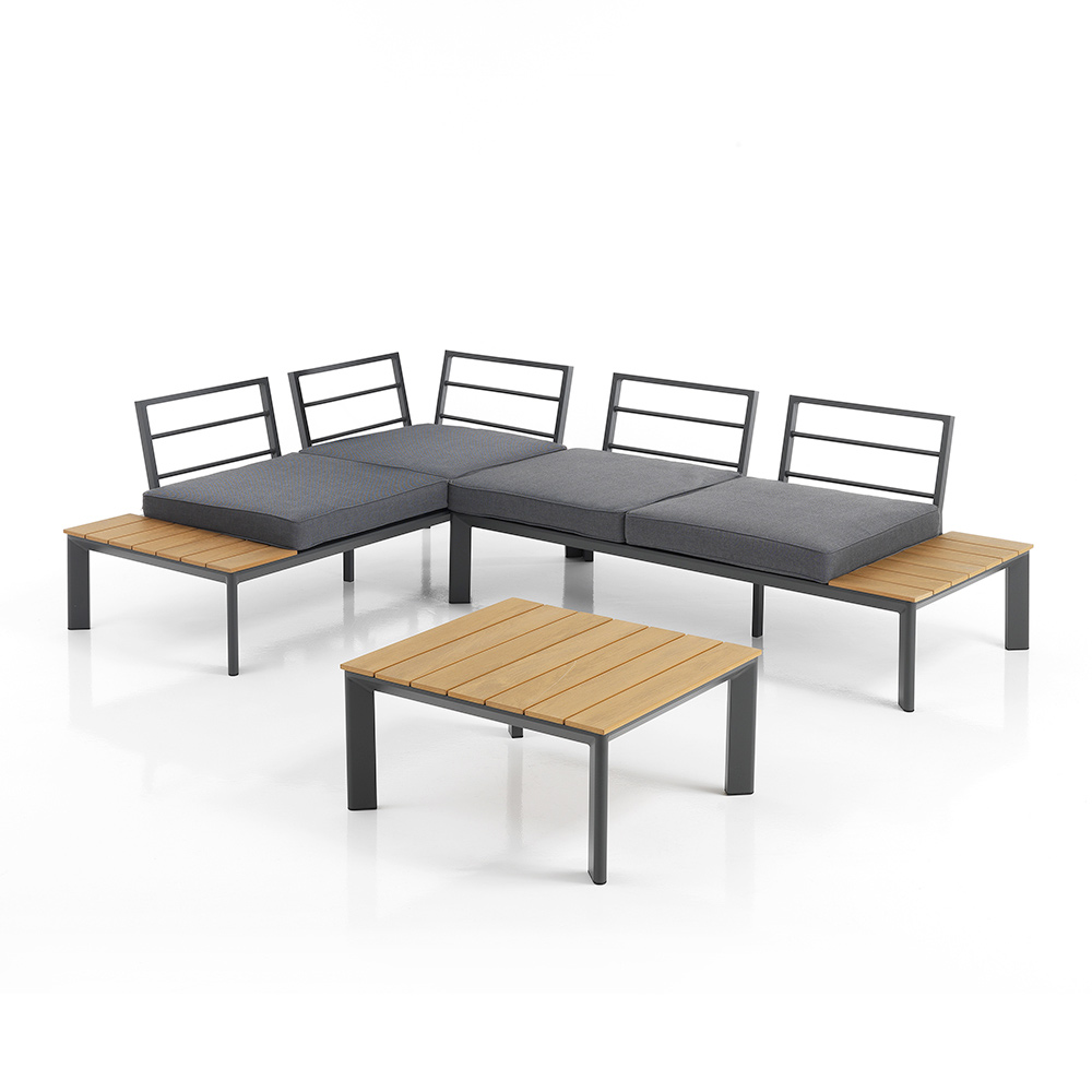 Este salão de jardim com mesa de centro incorpora luxo acessível e design versátil . A combinação única de alumínio e polywood oferece uma estética elegante e contemporânea que se adapta perfeitamente a espaços modernos e tradicionais. As almofadas de poliéster cinza não só proporcionam um conforto sublime, mas também acrescentam um toque de simplicidade sofisticada ao conjunto.