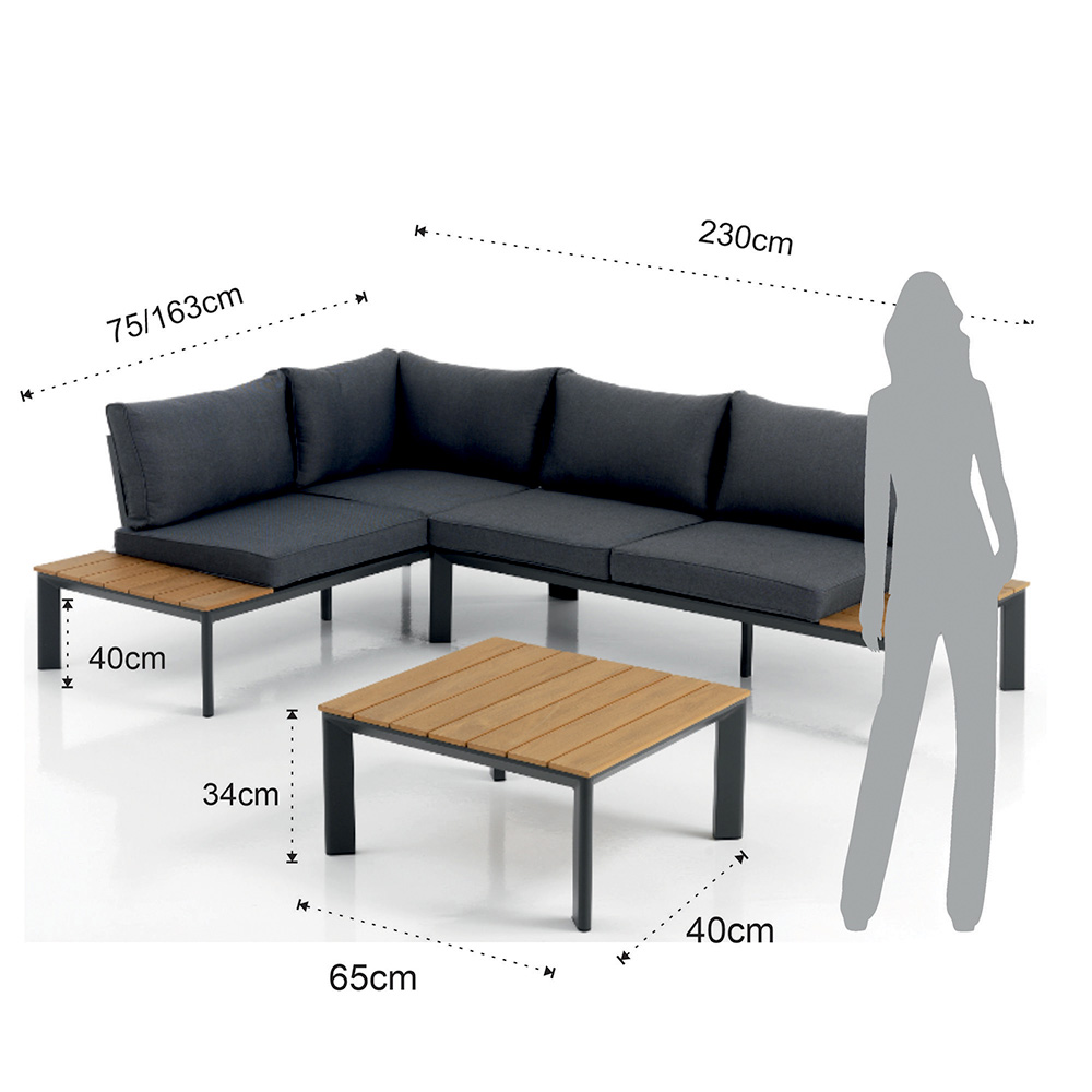 | Dimensões | sofá: 230x75/163x76 cm / mesa de centro: 65x40x34 cm |