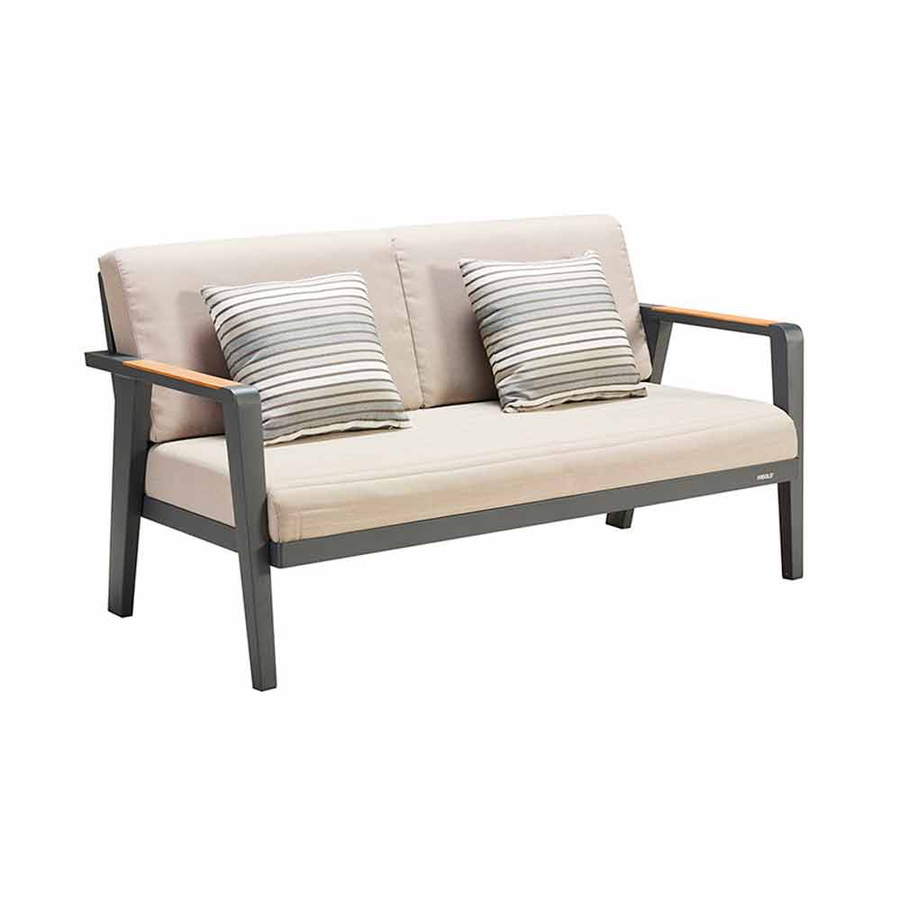 Salão de jardim com sofá de 2 lugares, 2 poltronas e mesa de centro em alumínio cinzento e teca.