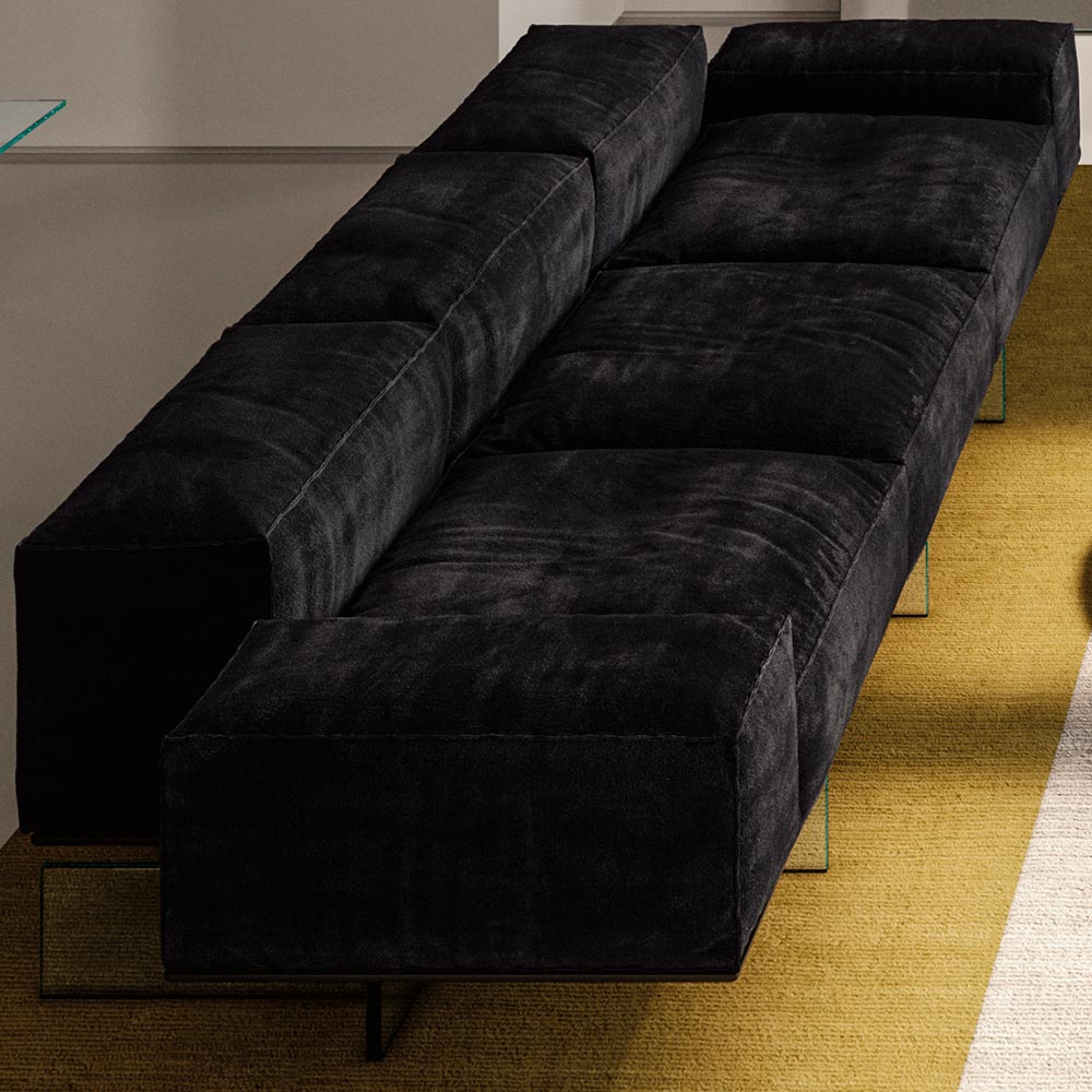 Composto por volumes macios e generosamente acolchoados, o sistema de assentos introduz uma nova forma de conceber o espaço habitacional, com elementos que permitem composições originais, mais dinâmicas e informais. O sofá mantém a leveza visual graças à base composta por pés de vidro laminado que sustentam uma plataforma de madeira sobre a qual repousam os elementos estofados. Tecidos sofisticados de alta qualidade e detalhes refinados nas embalagens são os diferenciais de um projeto de caráter nada convencional.