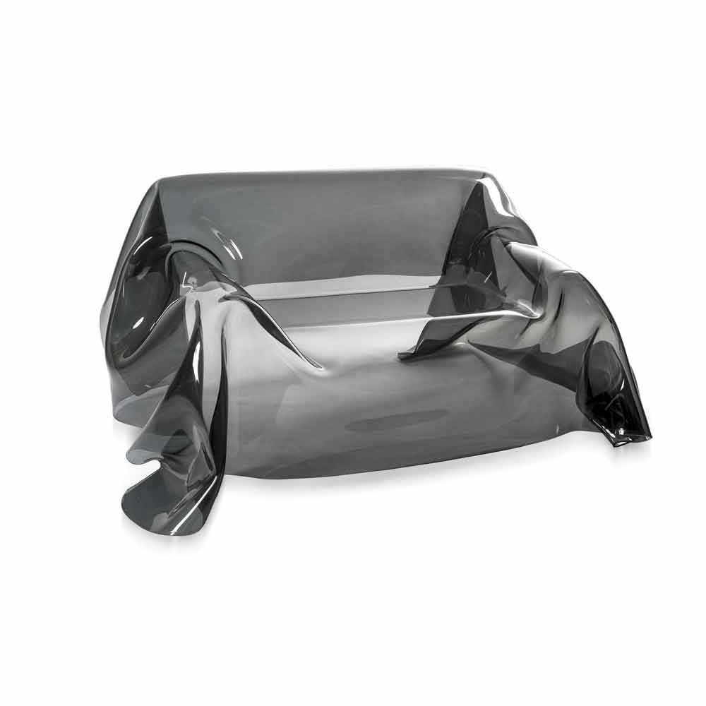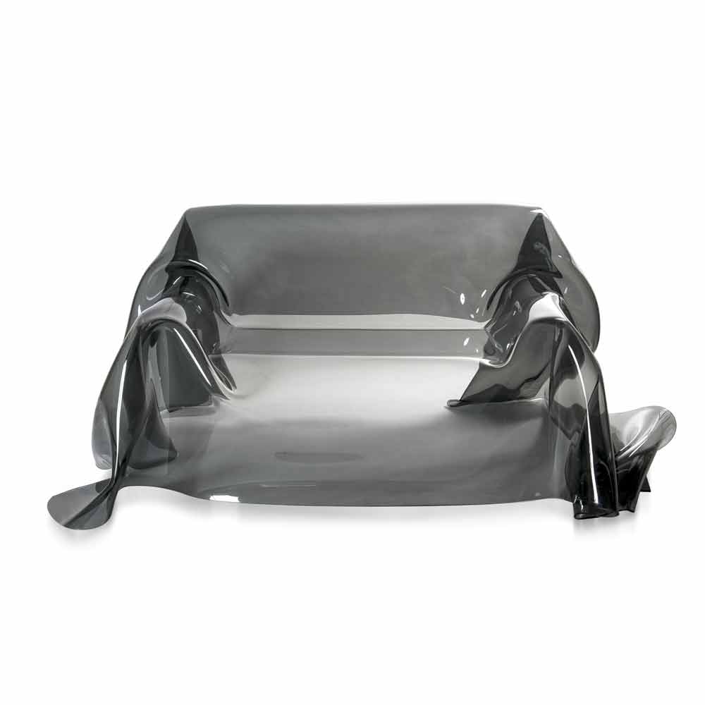 Cada sofá "Jolly" é uma peça única de arte moderna. De uma folha de plexiglass de cor cinza-fumaça transparente de 100% puro PMMA, mão-drapeado, vem um canapé exclusivo. Auto-sustentável, a poltrona pode acomodar 2 lugares.