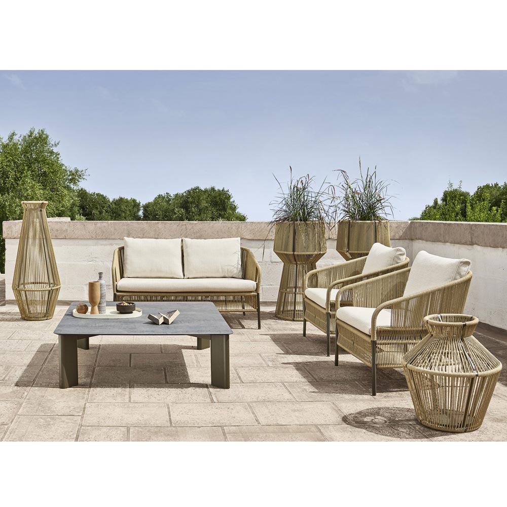 Sofá de jardim de dois lugares com estrutura em alumínio revestido a pó com acabamento cinza , assento tecido à mão em corda cor de cânhamo e Inclui 3 almofadas de marfim com enchimento dryfeel . Uma solução de mobiliário inovadora e fresca, enriquecida pelos maravilhosos acabamentos propostos que transformam o ambiente exterior com requinte.