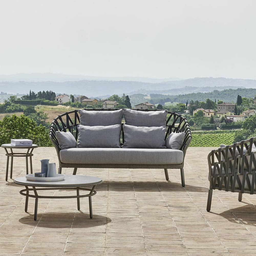 Sofá de dois lugares fabricado na Itália com estrutura em alumínio revestido a pó com acabamento cinza , encosto tecido à mão com faixa cor antracite e seis almofadas com enchimento dryfeel cor de carvão incluído. Esta peça de mobiliário foi concebida tanto para satisfazer os olhos com a sua estética elegante como para garantir um conforto autêntico.
