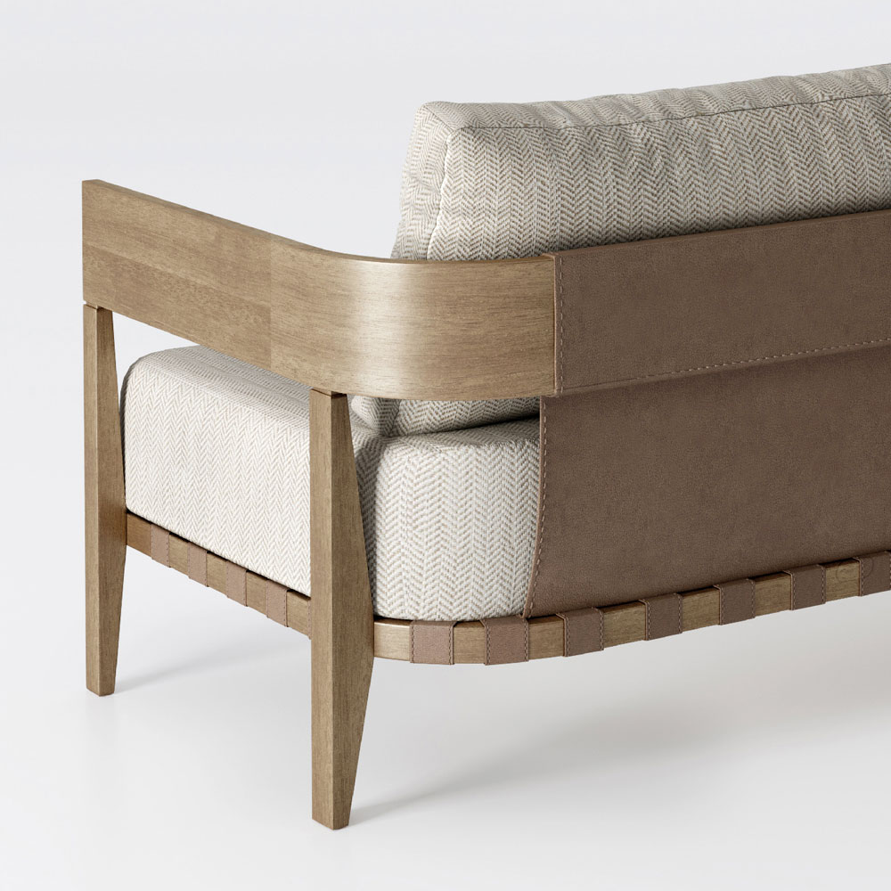 estrutura de madeira de teca envelhecida. O sofá é embelezado na estrutura do assento e no encosto com