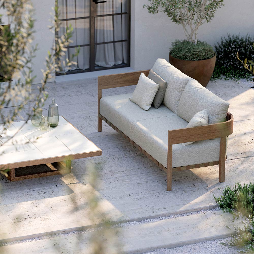 Sofá de jardim em madeira de teca com assento e encosto acolchoados Fabricado na Itália