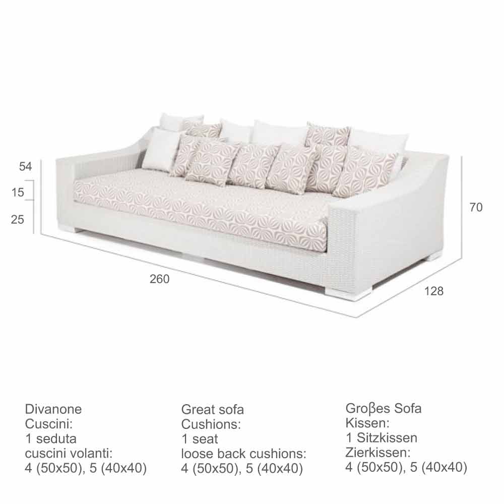 O sofá é preenchido com espuma de poliuretano coberta com tecido Tempotest (cores diferentes disponíveis). Este tecido é removível, repelente de água, fácil de lavar e resistente aos raios UV.