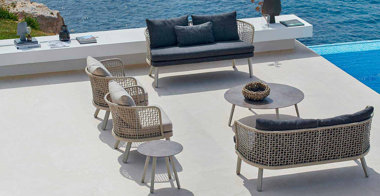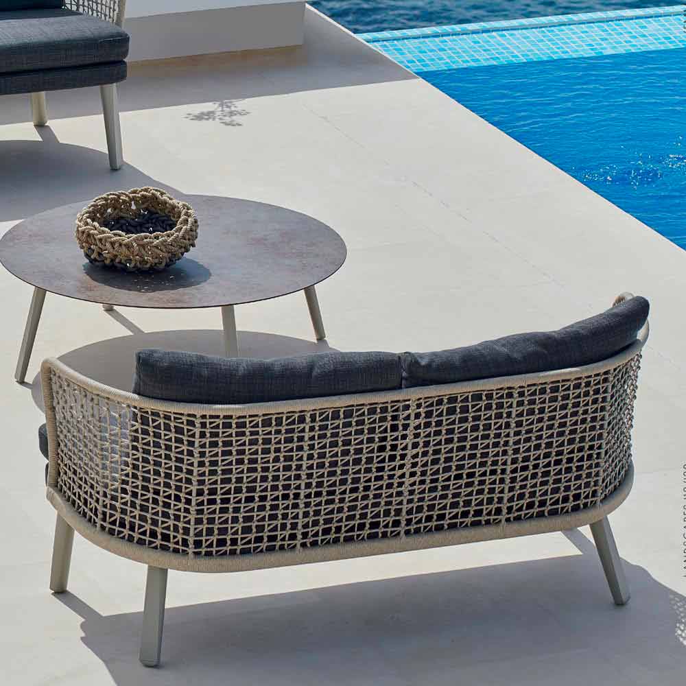 Emma é um maravilhoso sofá ao ar livre caracterizado por uma estrutura de fibra sintética tecida à mão com uma moldura de alumínio revestida a pó bege.