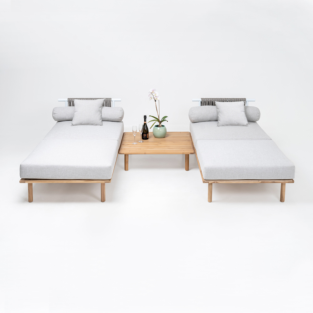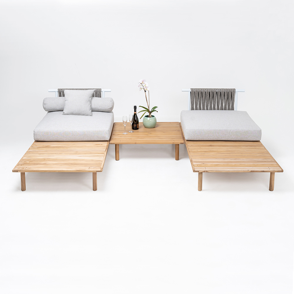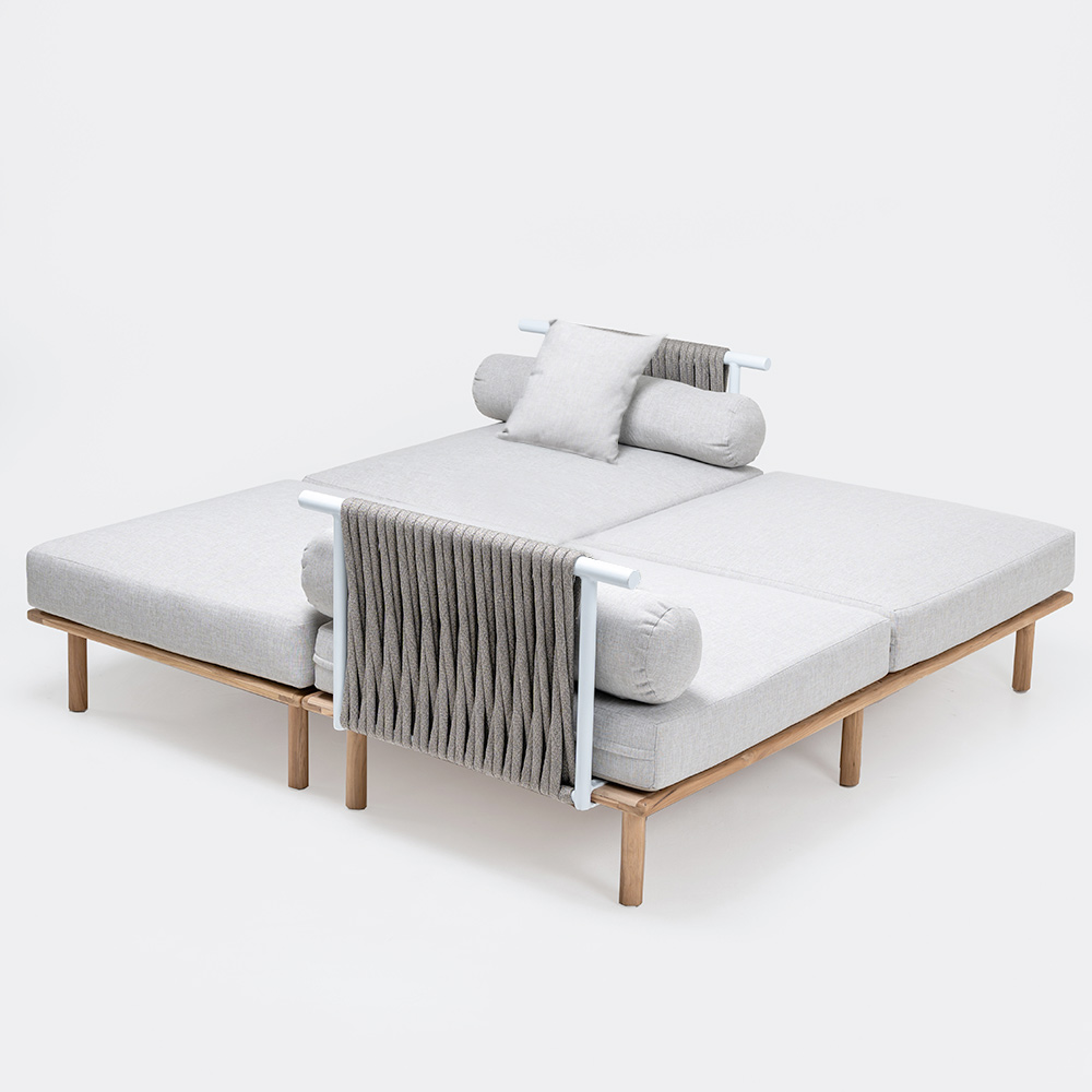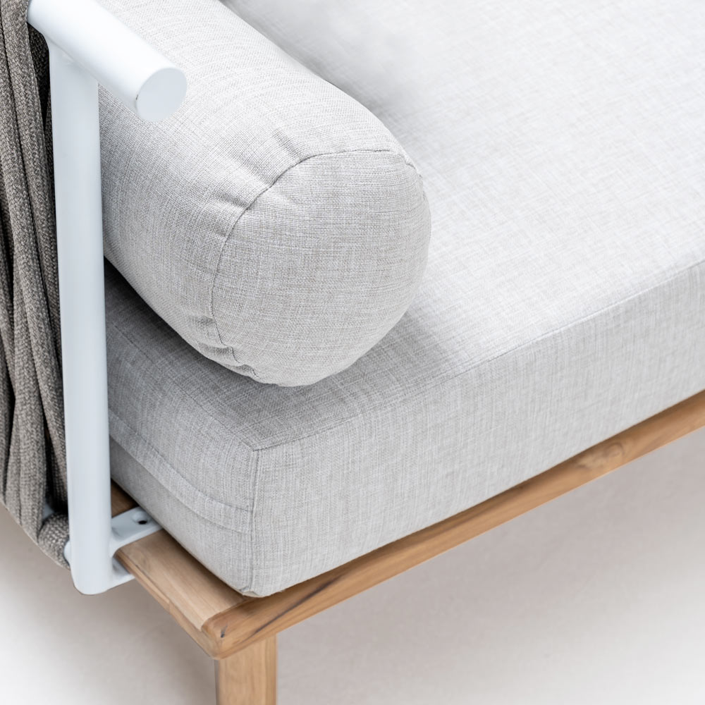 Sofá modular de jardim em teca, encostos de alumínio e trama em Olefin/PP ROPE e almofada