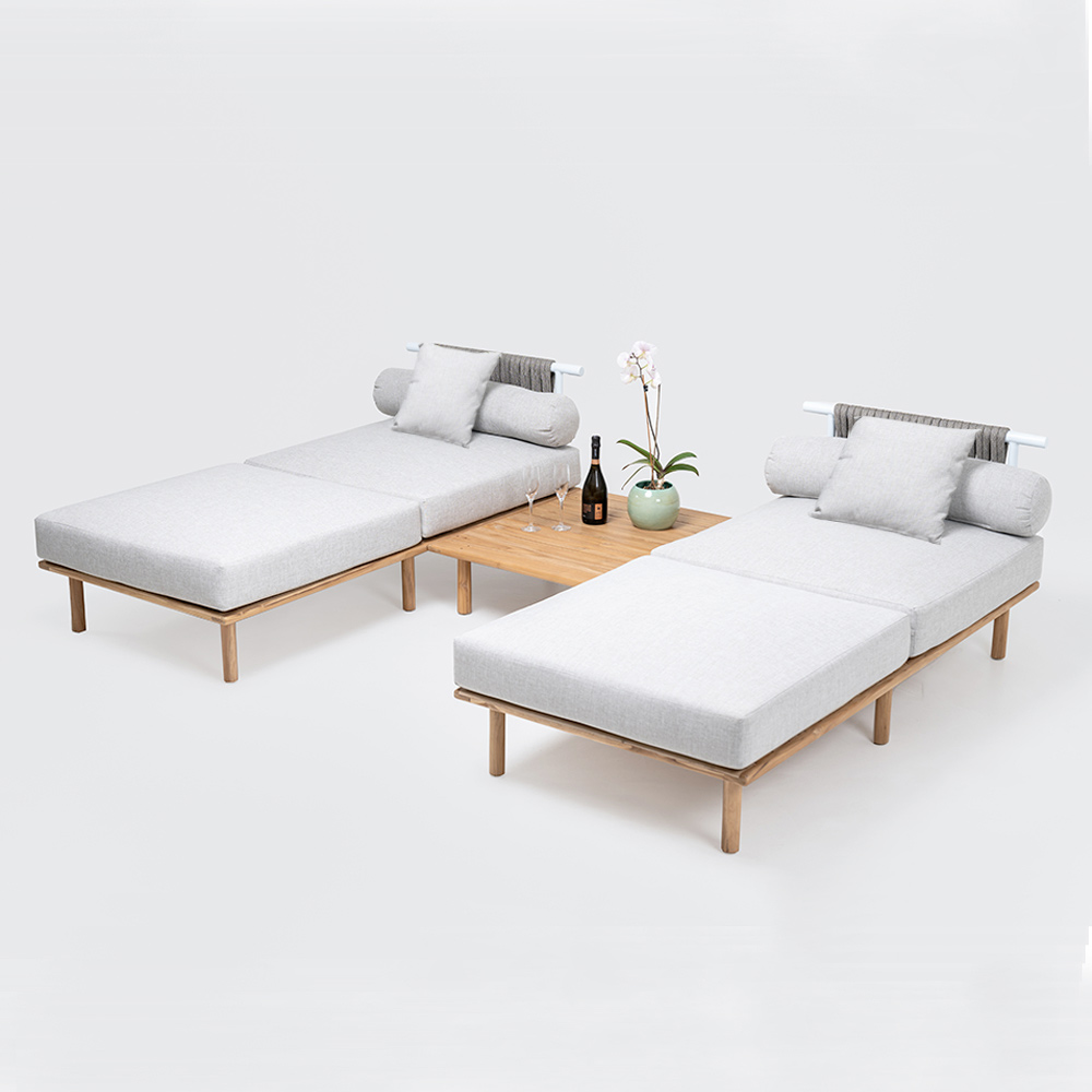 Este conjunto de jardim modular é o epítome da versatilidade e estilo . Projetado para se encaixar de forma elegante e funcional em qualquer espaço ao ar livre, é caracterizado pela combinação de materiais naturais e design contemporâneo . A madeira de teca , conhecida pela sua resistência e durabilidade, forma a base sólida sobre a qual repousam almofadas cinzentas claras suaves e convidativas.